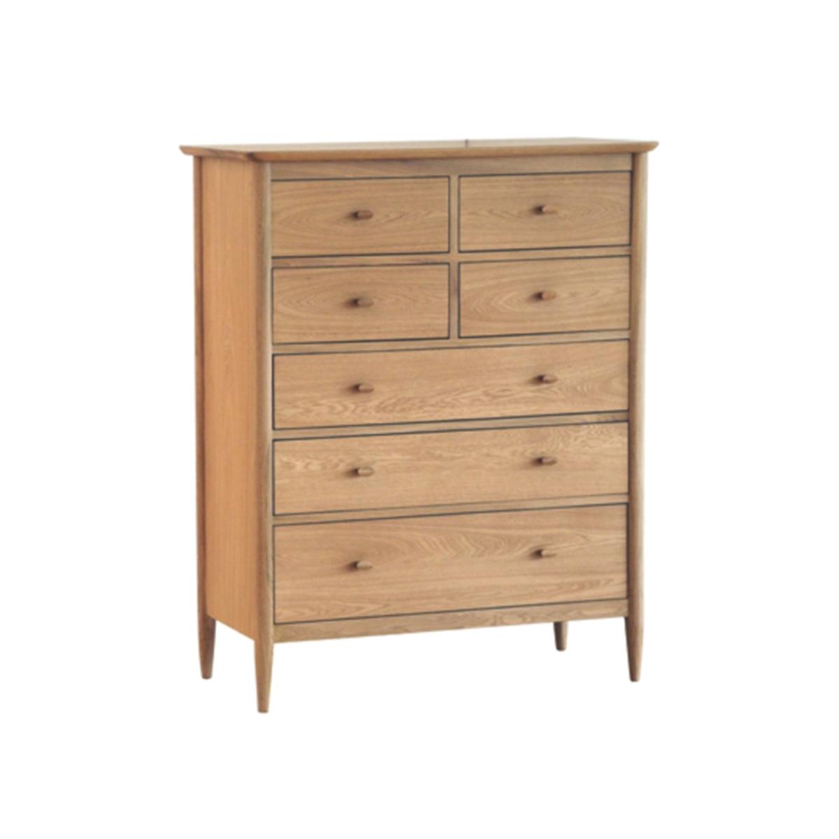 Classically Ercol, this 7 drawer Ercol Teramo chest of drawers, utters contemporary chic. This tall and wide chest, features four small drawers at the top, and three larger drawers at the bottom, your perfect storage solution for housing all of your clothes. Shaker simplicity, this Ercol chest of drawersembodies the epitome of shaker style, with its simple sleek lines and uncomplicated oval handles. This lovely light oak and oak veneer piece, is finished in a clear matt lacquer, helping to protect your oak. *Dimensions: H122cm W98cm L47cm *Solid oak and oak vaneers in construction with a clear matt finish *Simple self assembly