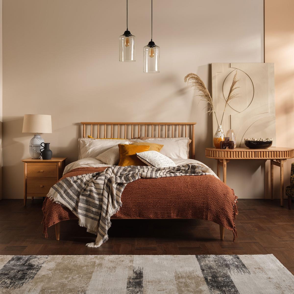 I’m a fan of the Teramo bed for its pared-back oak frame and elegant spindle headboard - it slots straight into Scandi, mid-century or coastal schemes without fuss. Its natural finish means you can layer up in soft, neutral linens and pops of muted colour or mix in textured throws and cushions for a lived-in feel. Styling tips: anchor it with a low-pile wool or jute rug and match with simple, turned-leg bedside tables. Go for ceramic or black metal lamps and a single piece of artwork above the headboard to keep the look crisp. A small plant or a neat stack of books on the side adds just enough personality without cluttering the clean lines.