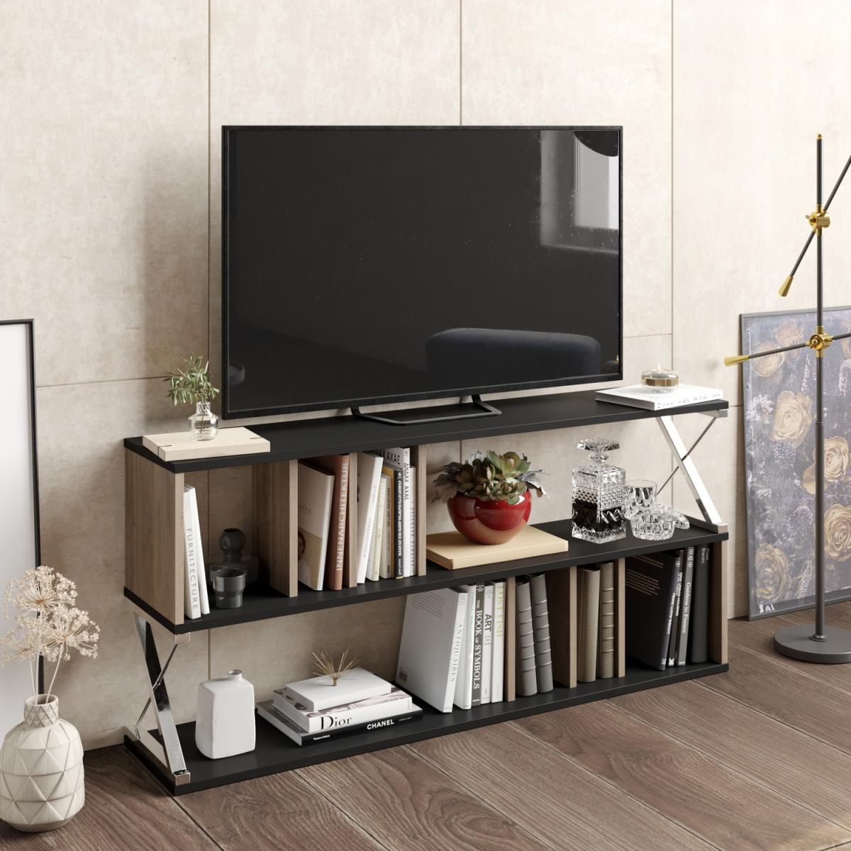 Termassini 55'' wide media stand and console for TVs up to 64" is one of the perfect combinations of metal and 18 mm thick melamine coated quality particleboard. Edges of the wood are banded with PVC edge banding tape. The metal frame is coated with scratch and impact-resistant static paint. Overall, the media stand is manufactured using eco-friendly and health-friendly materials. 2-tier and multi-compartment open shelves and 2 cubbies provide additional storage space for books, magazines, and other decorative accoutrements. A durable solid structure will give you the opportunity to use this TV stand for a long time.