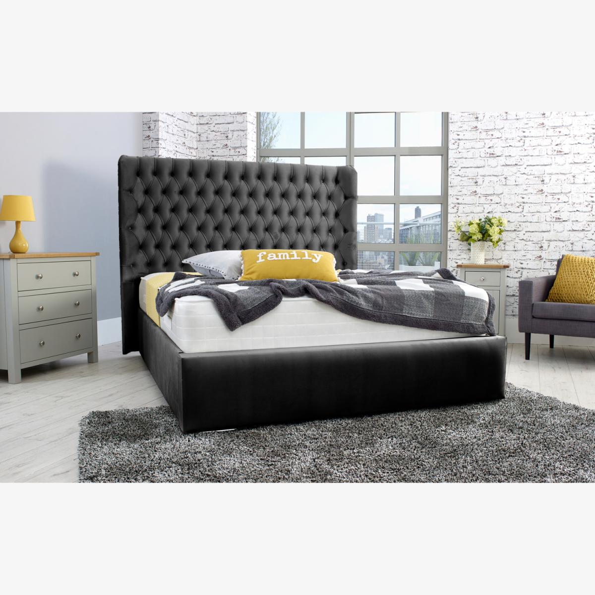The luxurious Terra bed features stylish and sophisticated curves with a winged headboard and elegant frame. It is the perfect addition to transform your bedroom into an inviting, cozy space. The hand-made headboard features exceptional traditional button detailing that gives the bed a comfy and luxurious look. When you want to relax and meditate, read a book, or watch the TV, you can sit up and relax on the headboard. It is comfortable and very relaxing. The Terra bed is designed with a sturdy wooden frame and padded luxuriously and then covered in silver plush velvet. It also features a solid board base and a 4-inch solid thick frame with chrome feet, which are perfect for mattress support. The mattress in the image does not come with the package.