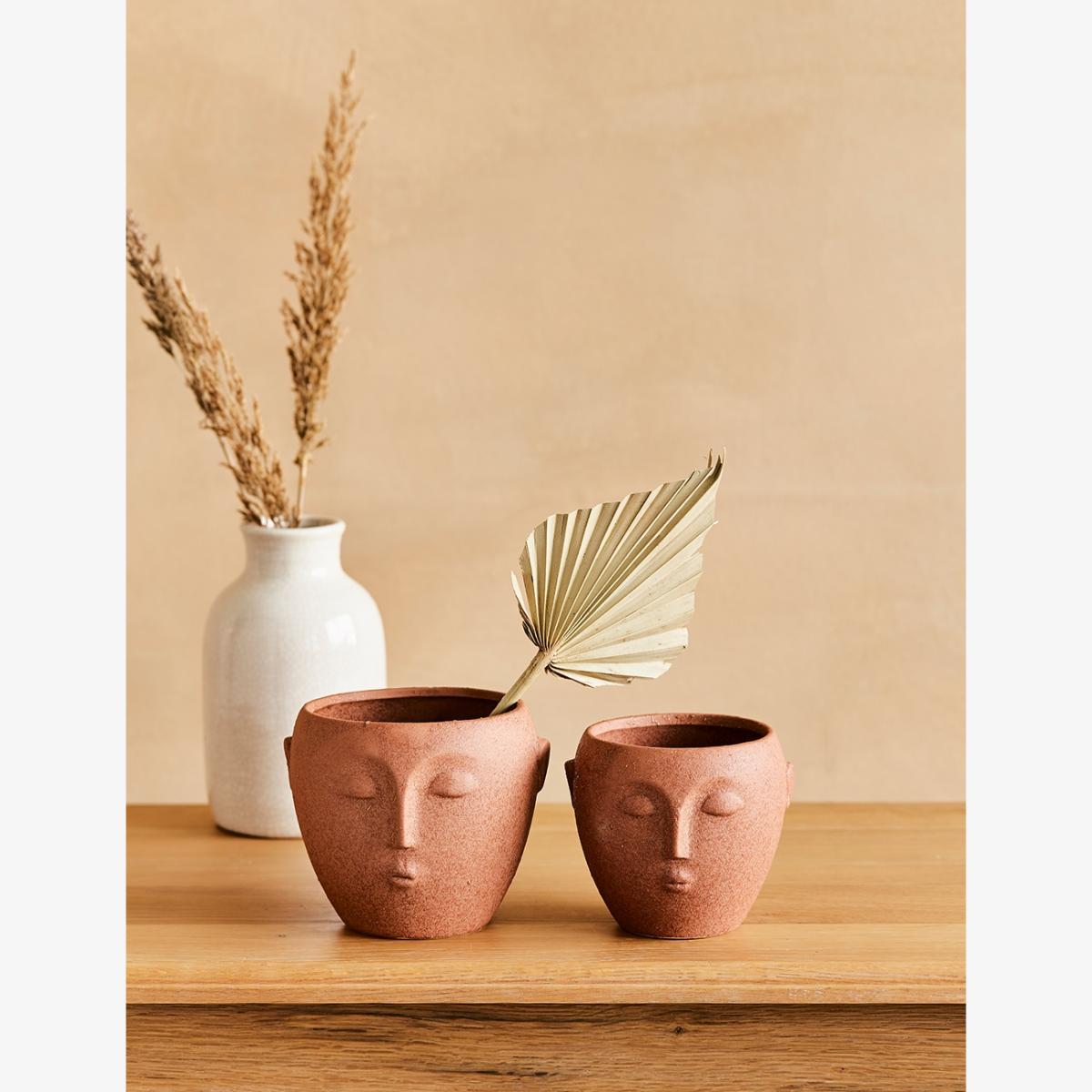 I love this face-shaped terracotta pot for adding a playful yet sophisticated touch to a variety of interiors. Its earthy tone works beautifully in both modern minimalistic schemes and more eclectic, bohemian settings. The two sizes are practical for grouping together on a shelf, windowsill, or side table, allowing you to play with plant heights and compositions. To style it effectively, consider pairing it with leafy or trailing plants like pothos or ferns for a lush contrast, or a small succulent for a clean, contemporary look. These pots are versatile enough to complement natural materials like wood and woven textiles, making them a fun yet understated addition to your plant display.