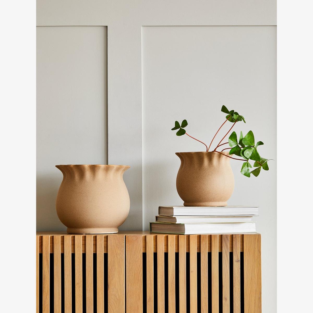 I love this terracotta sand pot for its warm, earthy tone and subtle frilly edge detail, which adds a touch of softness to your plant styling. Its natural material makes it versatile, working well in both modern schemes with minimal palettes and more bohemian or rustic interiors. When styling, try grouping the smaller size with a variety of leafy greenery or succulents for an inviting display, or use the larger to make a statement on its own. Practical tip: pair with a simple plant like a pothos or a small fern to soften the look, and consider placing it on a natural wooden surface or shelf to enhance its organic feel.