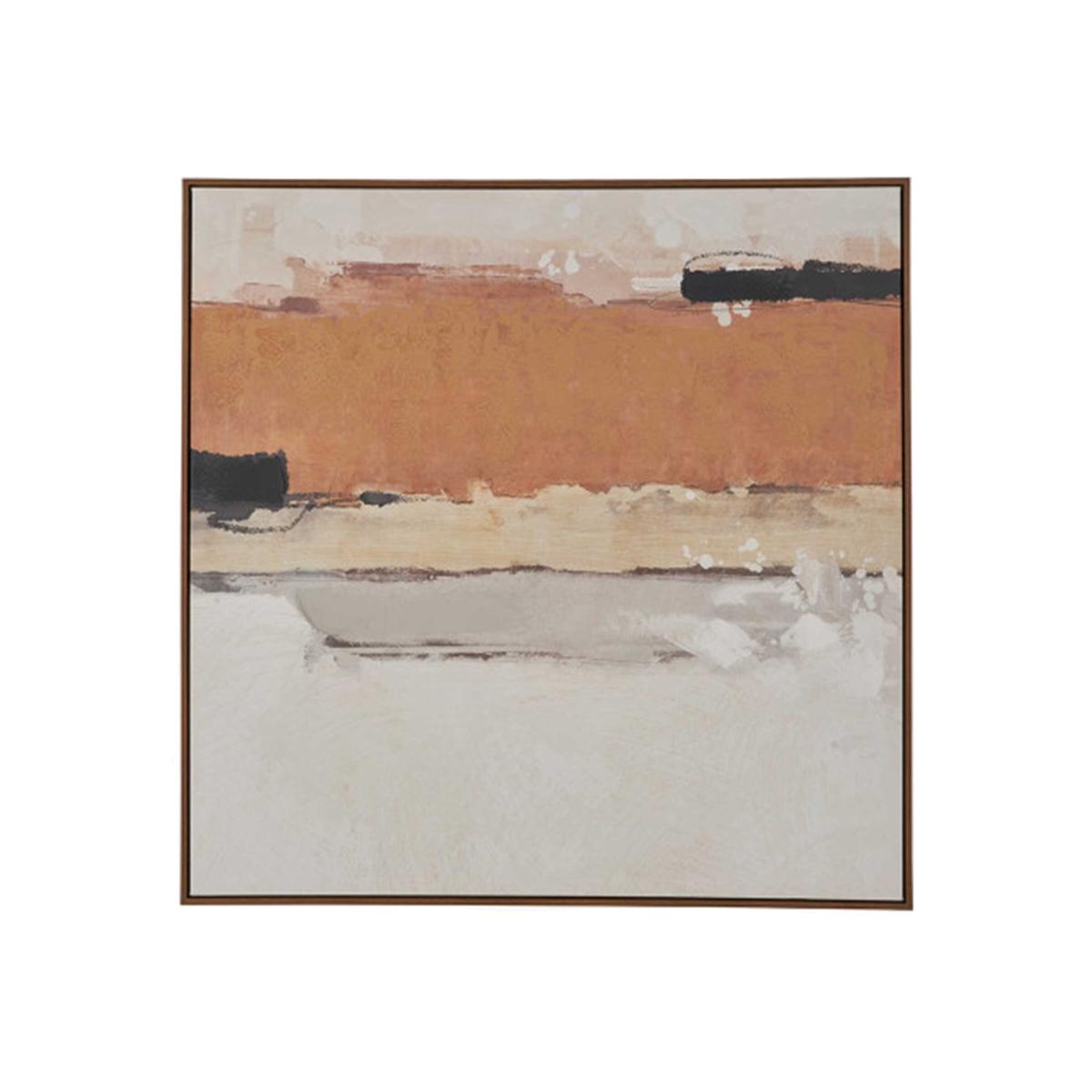 I love the terracotta stripe on the canvas - it offers a warm, earthy tone that can add character and a touch of colour to both contemporary and traditional interiors. It works particularly well in spaces that feature neutral palettes, as it provides a subtle visual interest without overpowering the surroundings. This piece is versatile enough to hang above a sofa, in a hallway, or even in a bedroom to create focal points. For styling tips, consider pairing it with soft textiles like linen cushions or a wool throw for added texture, and complement it with minimalist or natural wood furniture to enhance its understated sophistication. Its framed finish also makes it easy to integrate into a gallery wall or as a standalone statement piece.