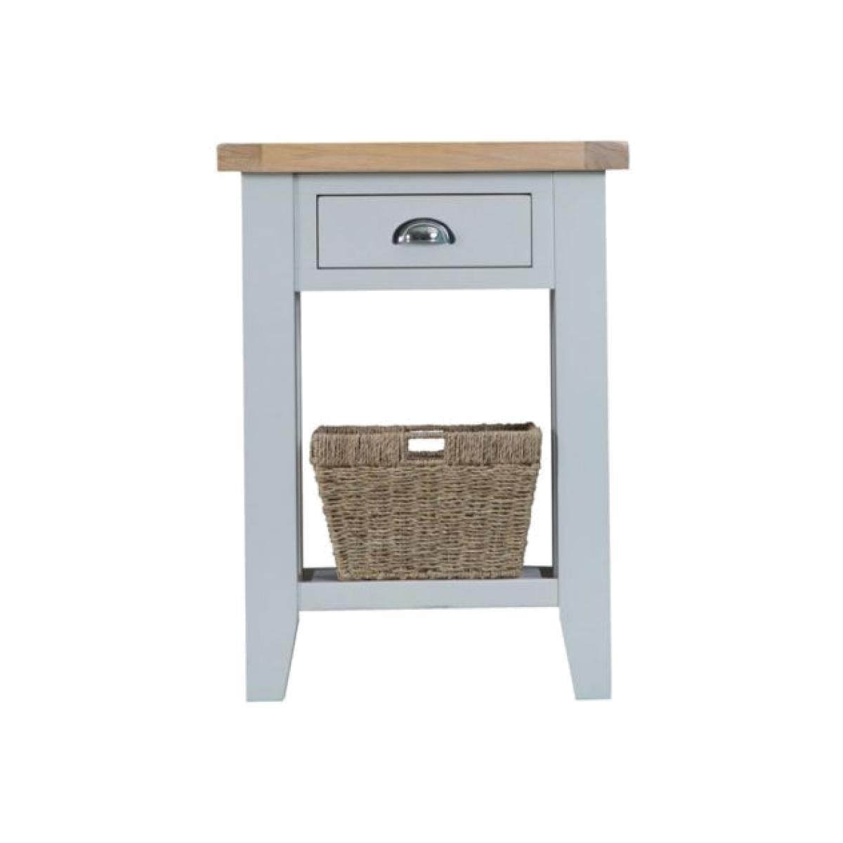 I love the terranostra oak phone table for its versatile design and subtle colour palette. Its soft grey finish makes it a great fit for both modern and traditional interiors, especially those with a coastal or Scandinavian vibe. The natural oak top adds warmth, creating a lovely contrast with the grey base. Practical styling tips include using it as a catch-all surface for keys or mail, or pairing it with a favourite table lamp for cosy evenings. The open shelf with the woven basket offers handy storage without clutter, making it perfect for hallways or living rooms. Overall, this side table combines function and style effortlessly, adding a touch of understated charm to any space.