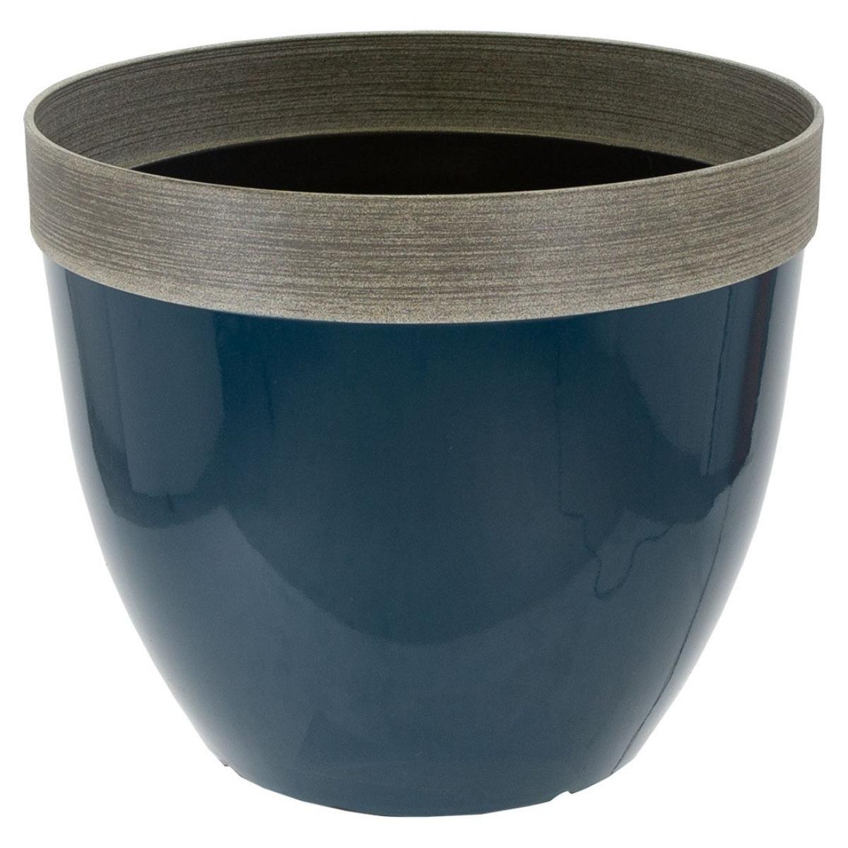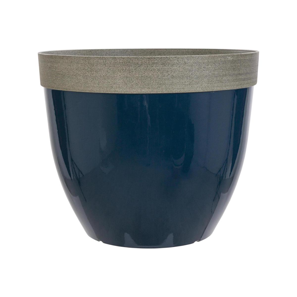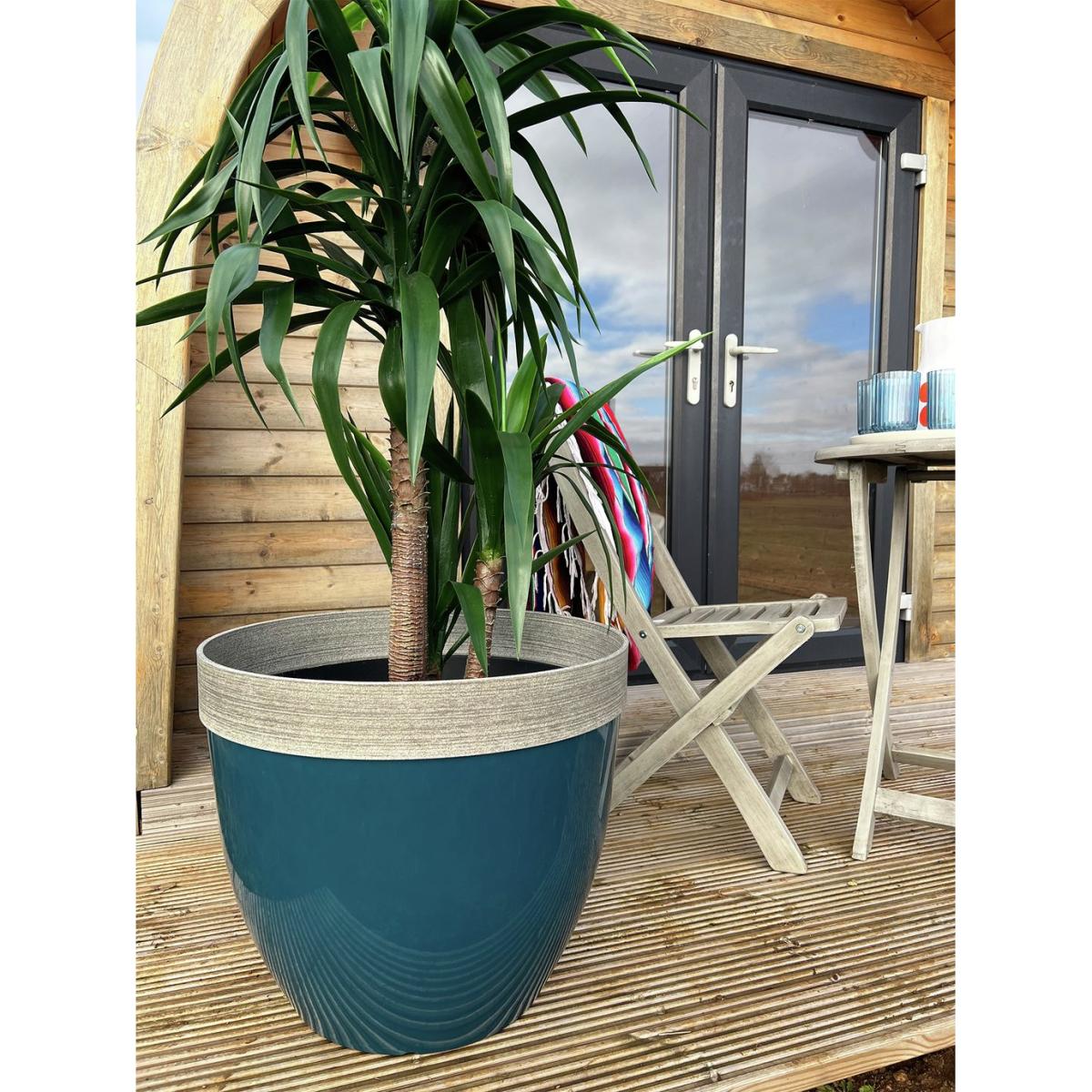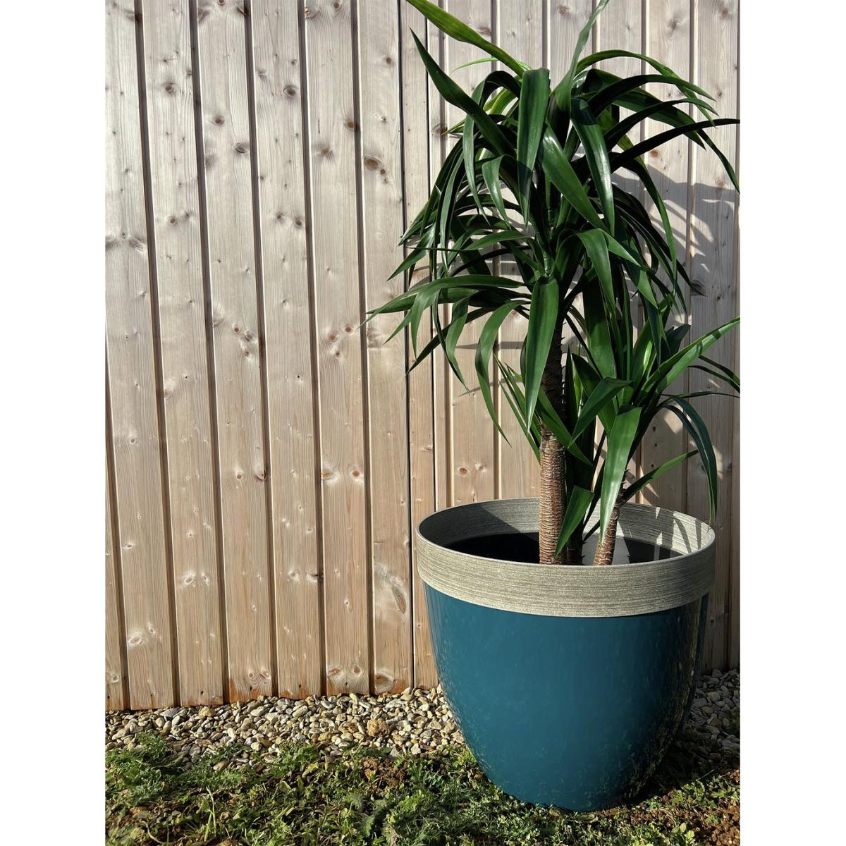 Made from 100% recycled materials, this striking large blue glaze effect plastic planter has a brush-effect grey rim and is ideal for the planting of flowers and shrubs or even small trees. Being frost-resistant, this pot is ideal for outdoor use year-round. This plant pot makes a wonderful gift for the avid gardener in your life or even yourself to spruce up your garden decor. Made from plastic. Frost resistant. Fade resistant. Drainage holes. Capacity: 70liters. Size H46, W54, D54cm, Diameter 54cm. Weight 2.25kg. Manufacturer's 1 year guarantee.