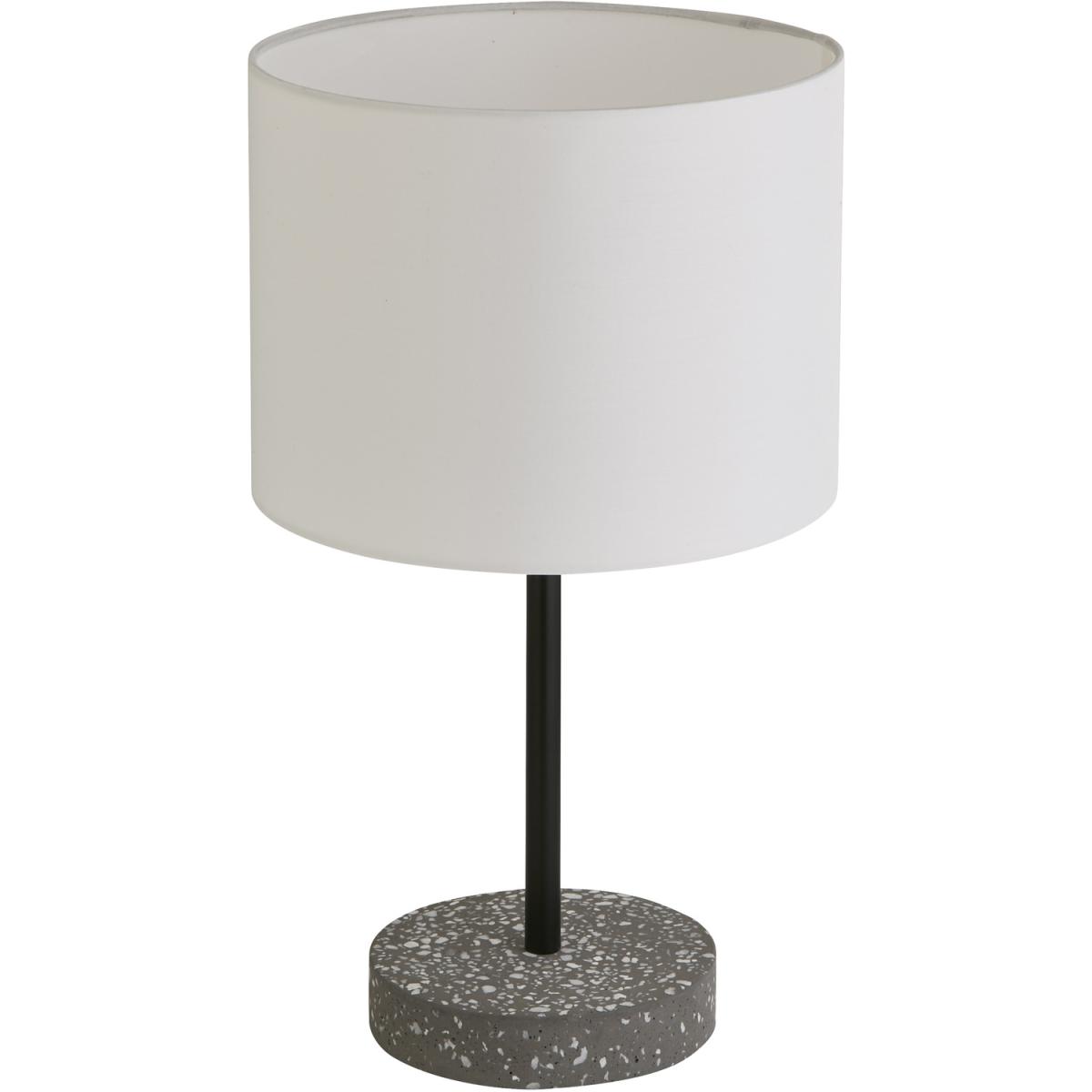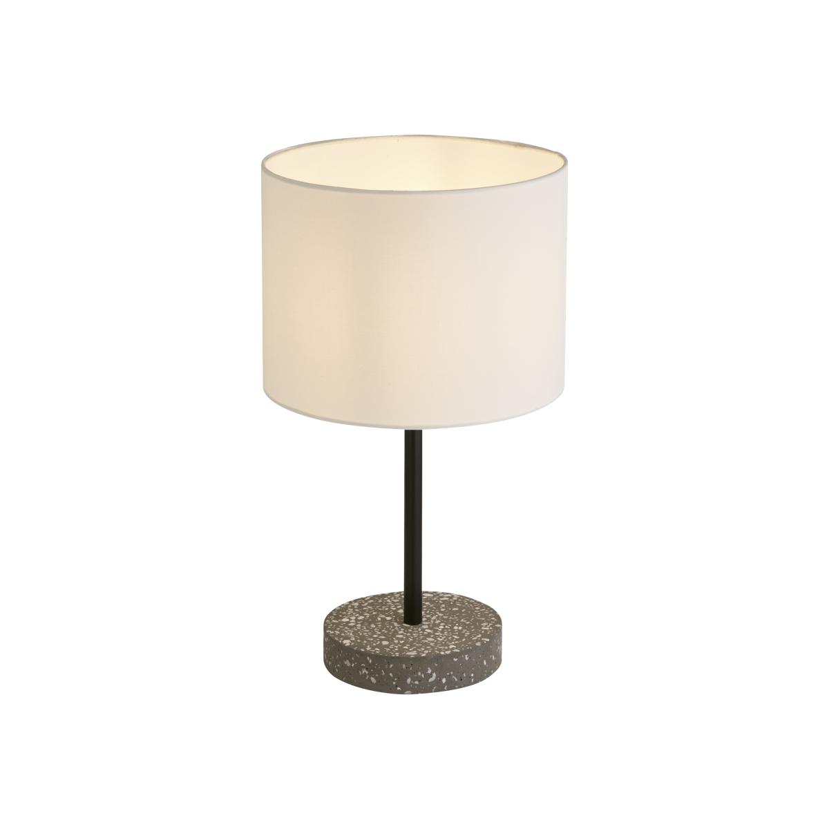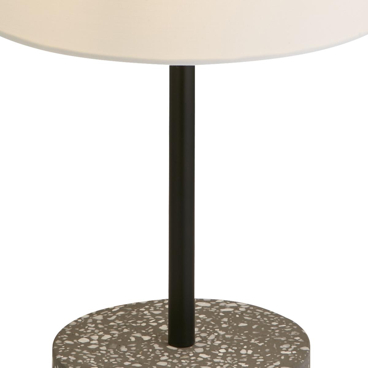 Chips of marble, quartz, granite, glass are embedded into a concrete disc which acts as the base for this modern table lamp. A white fabric drum shade complements the black stand to finish off a lamp.