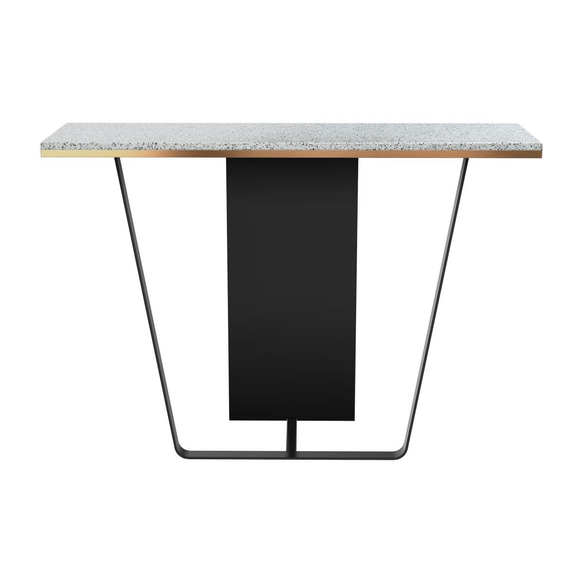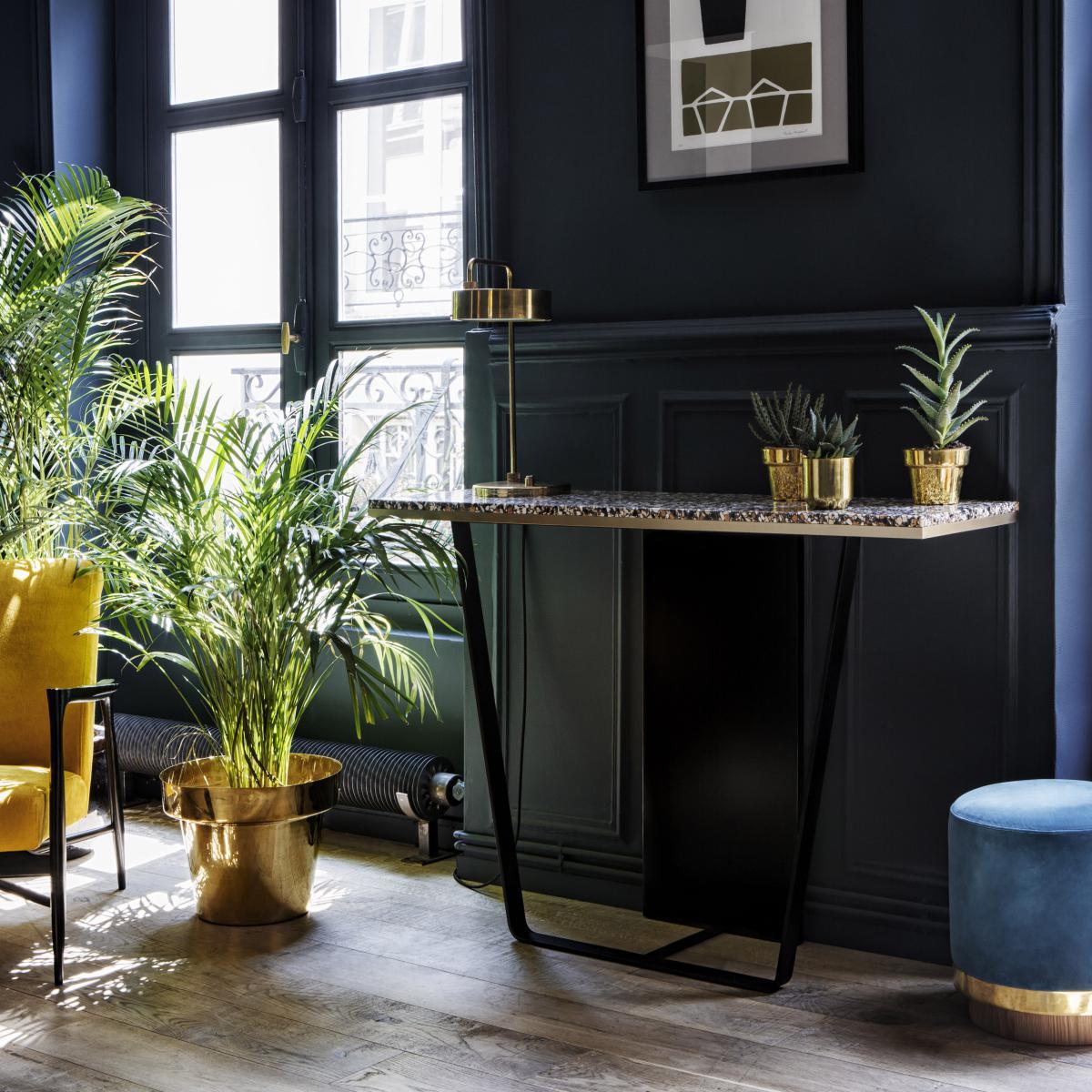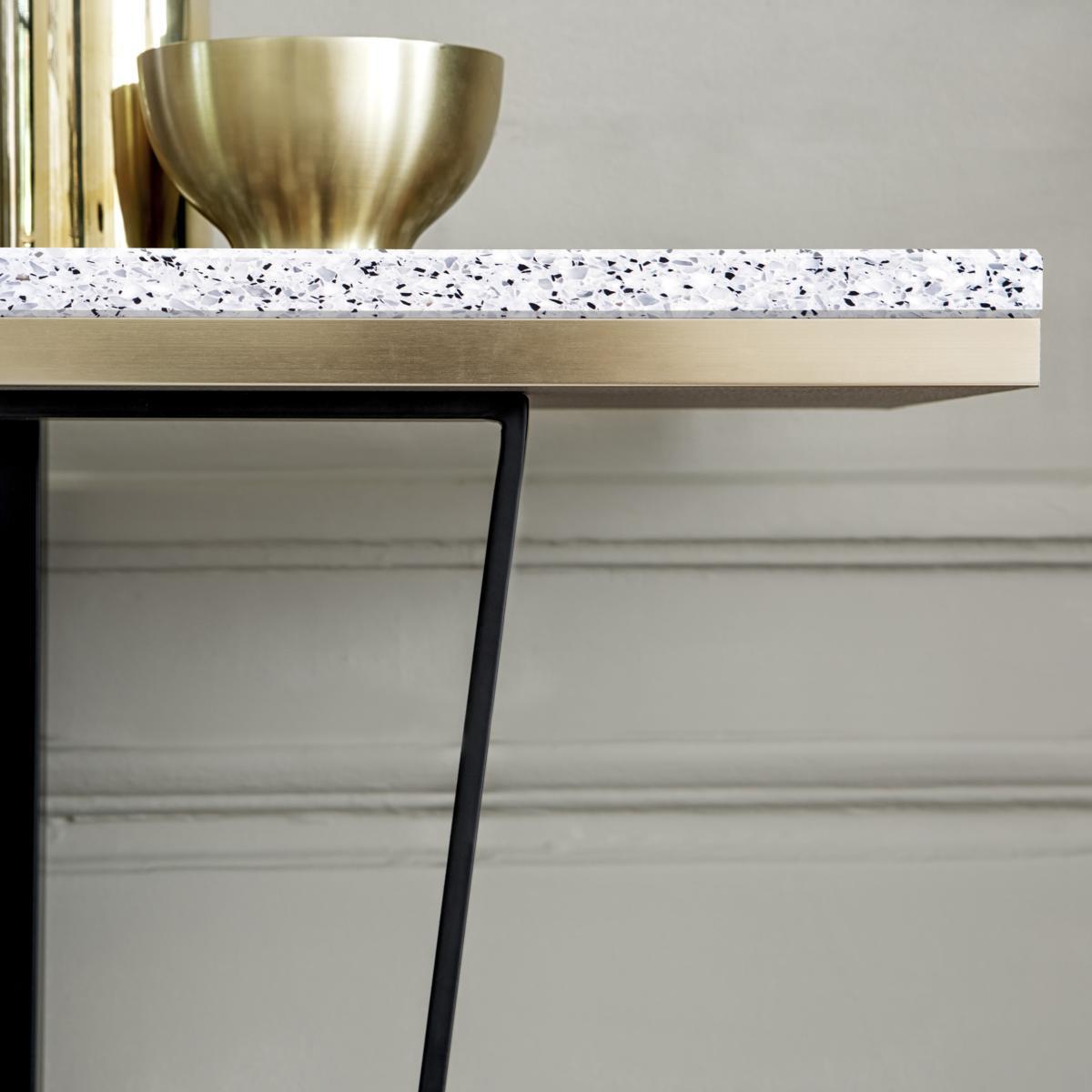 This high-end console revisits the use of terrazzo with modernity and elegance. Mixing influences and styles, the Terrazzo console is a clever mix of vintage inspiration and contemporary design. This console offers a superb combination of noble materials. Refined and very chic, the top is made of terrazzo (a mixture of fragments of stone and cement). Colourful, cheerful and full of joy, this mineral material with its irregular mottled patterns refers back to the famous Memphis design movement that used it a lot in the 80s. The top is encircled with golden brass. The raw yet chic look of Terrazzo blends harmoniously with the sophistication of brass. Ethereal and architectural, the black lacquered steel base draws geometric lines. Its graphic, contemporary look contrasts with the luxurious, classic aspect of the top. With its irregular mottled patterns, unique colours and singular character, this original console will give your home a certain cachet. Very sophisticated, the Terrazzo console reflects the French way of life cultivated by Parisian brand Red Edition. Parisian brand Red Edition invites you to rediscover a French way of life with modern design codes. Its recipe: a Parisian signature, clean lines and a requirement for noble materials.