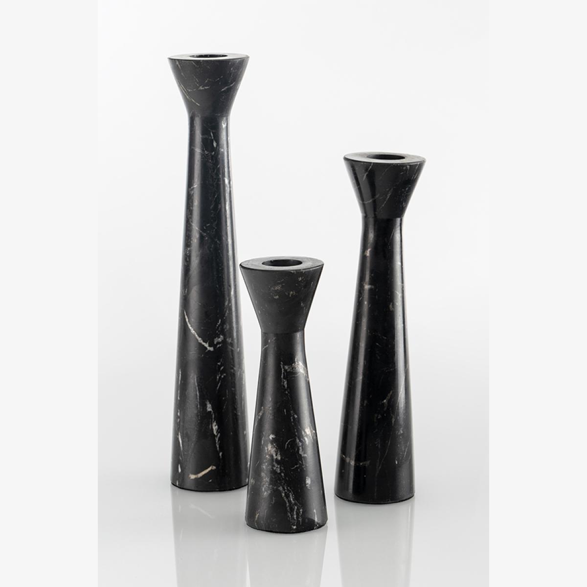 A refined and opulent set of candle holders. Sculpted from beautiful black marble into a silhouettes. The set includes 3 candle holders of various sizes. Fits standard 2cm taper/dinner candles. Dimensions provided are not including candles.