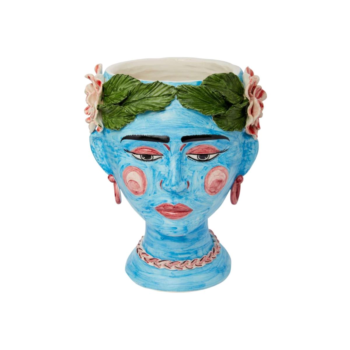 A surreal blue hand-painted Sicilian vase in the shape of a woman’s head. Who is she? Read on…