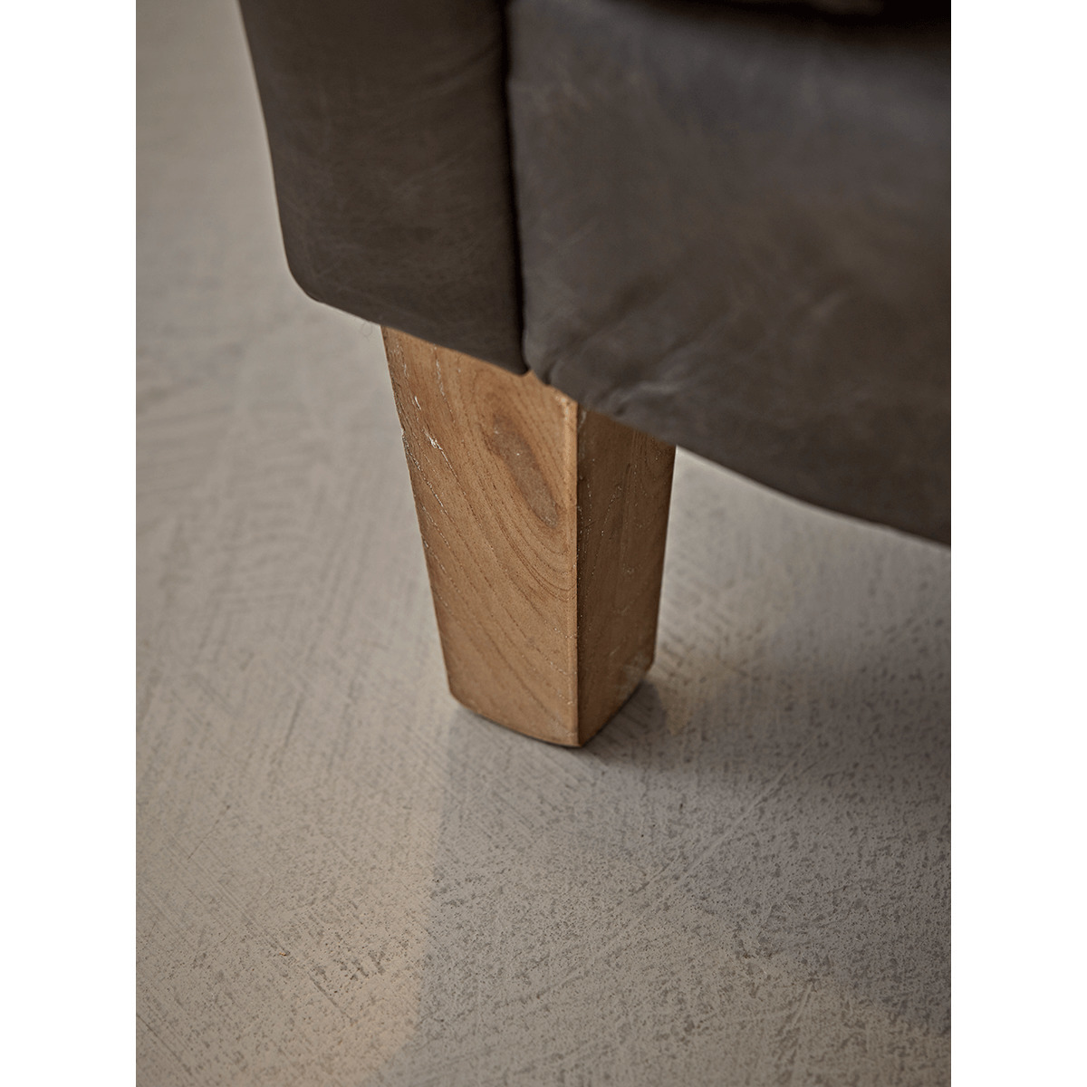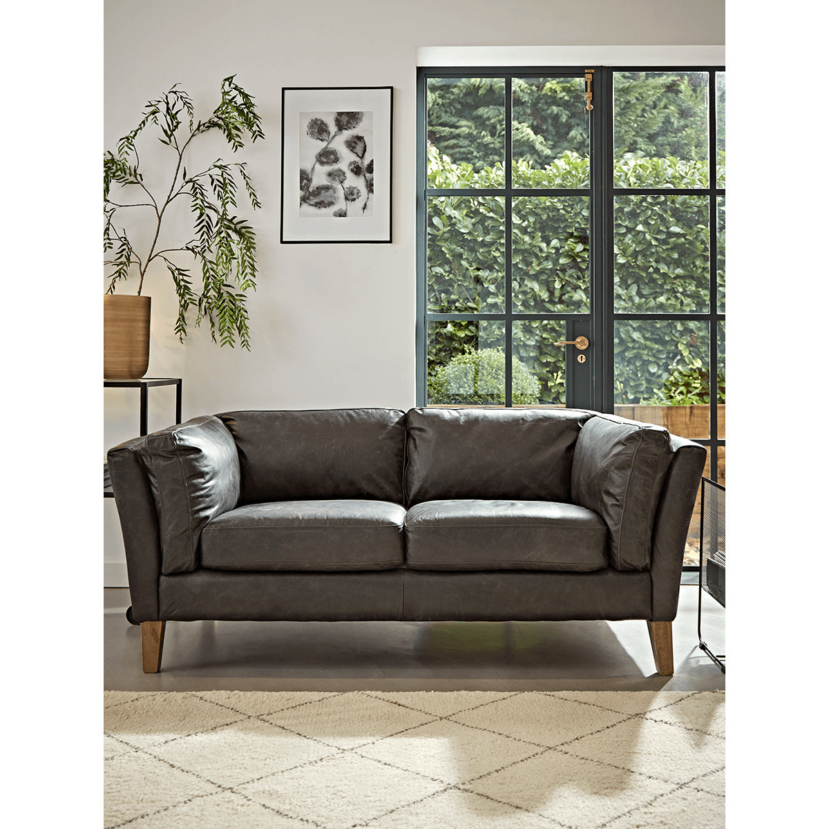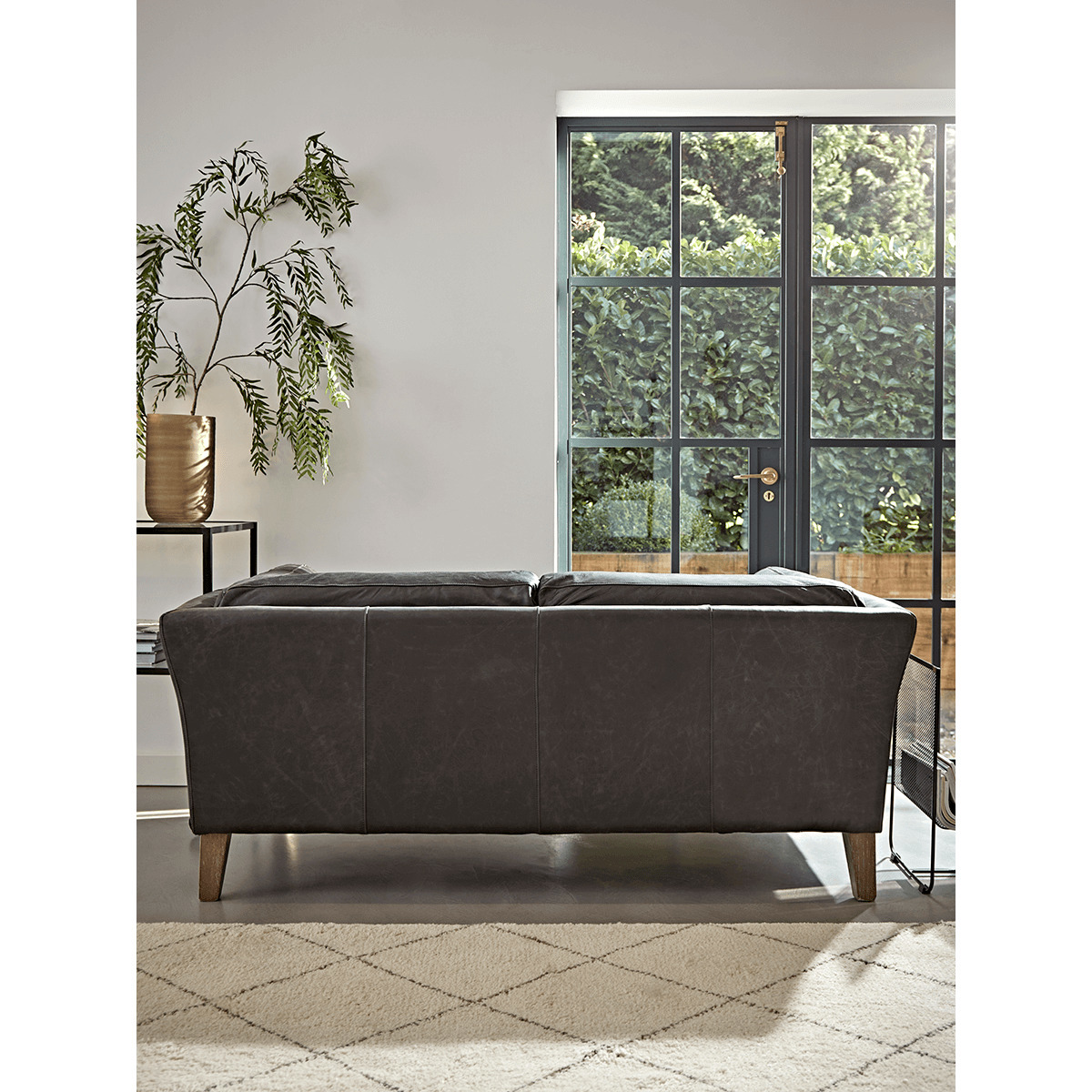Plush and amazingly comfortable, our statement two seater sofa is upholstered in butter soft leather in deep black. Perched atop four wooden legs with a simple, elegant shape, each piece has flared arms and comes complete with two seat cushions, two back cushions and two armrest cushions for ultimate comfort.
