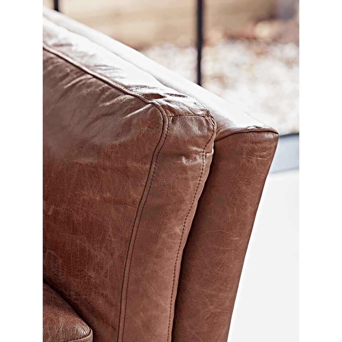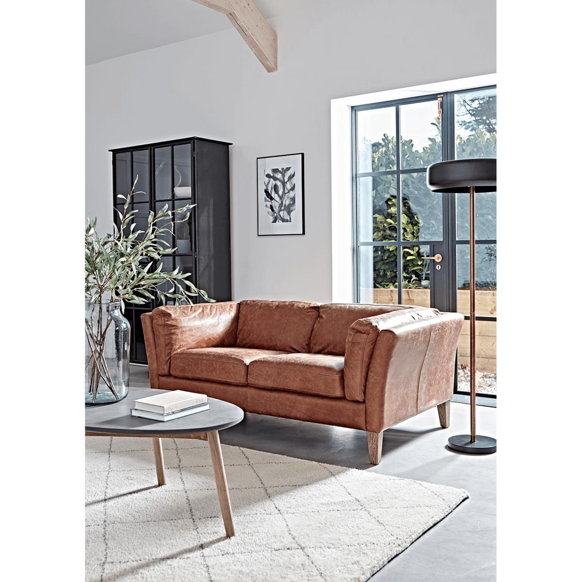 Plush and amazingly comfortable, our statement two seater sofa is upholstered in butter soft leather in rich tan brown. Perched atop four wooden legs with a simple, elegant shape, each piece has flared arms and comes complete with two seat cushions, two back cushions and two armrest cushions for ultimate comfort. Style with our. Black & Brass Club Floor Lamp. And. Black Iron Display Cabinet - Tall. To recreate our look.