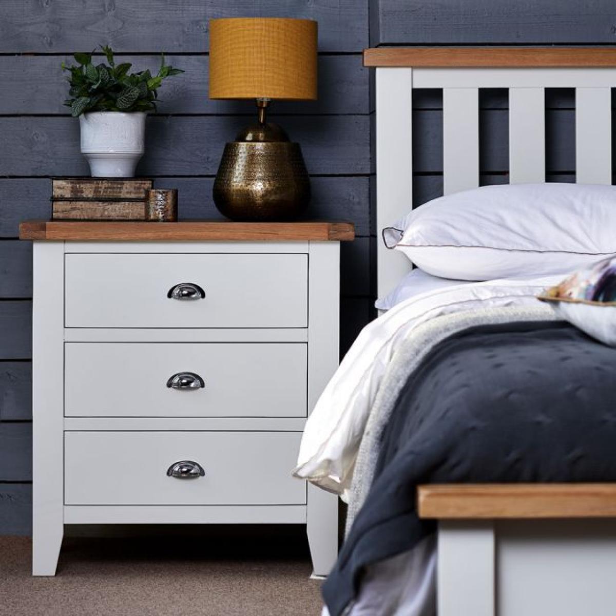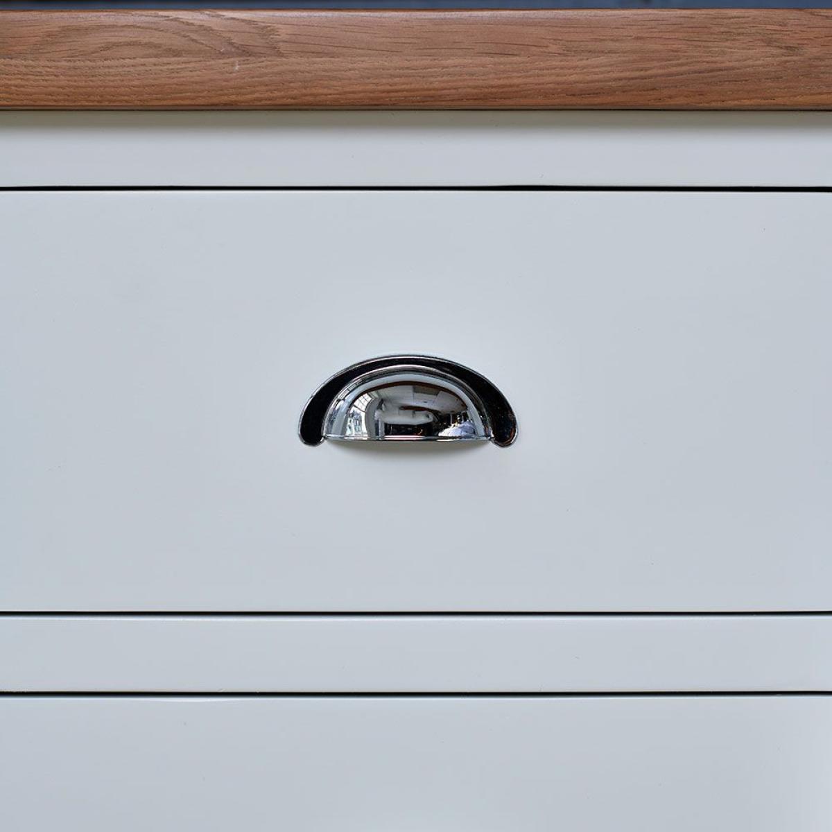 The Tetbury. 3 drawer chest of drawers. Has been beautifully crafted from oak and features a bare oak top and chrome cup handles. A stunning example of contemporary bedroom furniture, these white drawers are the perfect size for a guest room for your visitors to store away their clothes. Team this white 3 drawer chest of drawers with the rest of the Tetbury white and oak bedroom furniture collection to complete the look. Dimensions W75cm x D40cm x H80cm.