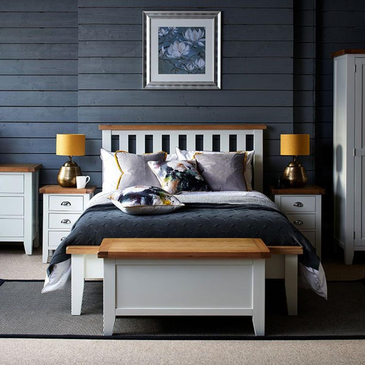 The Tetbury white bed frame has been beautifully crafted from oak. A stunning example of contemporary bedroom furniture, this white wood bed frame features a contrasting bare oak top to the slatted headboard. Team this white bed frame with the rest of the Tetbury white and oak bedroom furniture collection to complete the look. White single bed frame dimensions W105cm x D205cm x H120cm. White double bed frame dimensions W150cm x D205cm x H120cm. White king size bed frame dimensions W165cm x D215cm x H120cm. White super king bed frame dimensions W193cm x D215cm x H120cm Simple self assembly