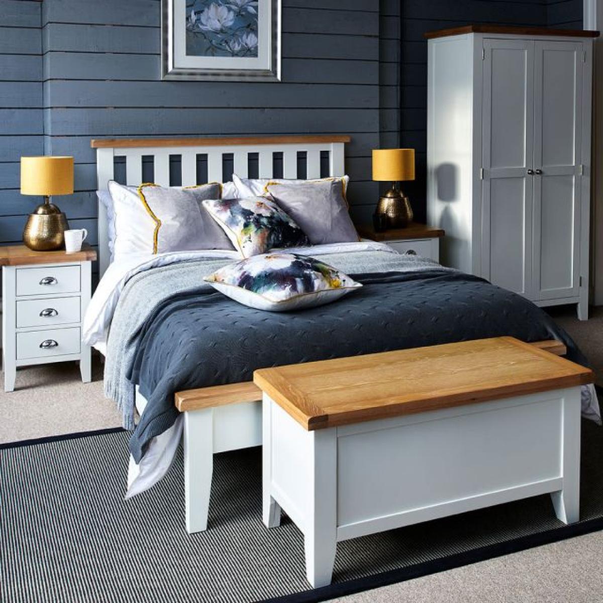 The Tetbury white bed frame has been beautifully crafted from oak. A stunning example of contemporary bedroom furniture, this white wood bed frame features a contrasting bare oak top to the slatted headboard. Team this white bed frame with the rest of the Tetbury white and oak bedroom furniture collection to complete the look. White single bed frame dimensions W105cm x D205cm x H120cm. White double bed frame dimensions W150cm x D205cm x H120cm. White king size bed frame dimensions W165cm x D215cm x H120cm. White super king bed frame dimensions W193cm x D215cm x H120cm Simple self assembly