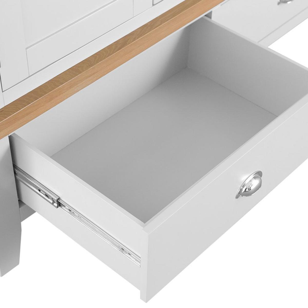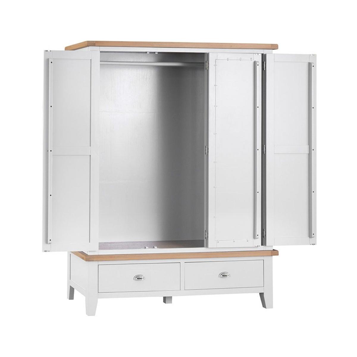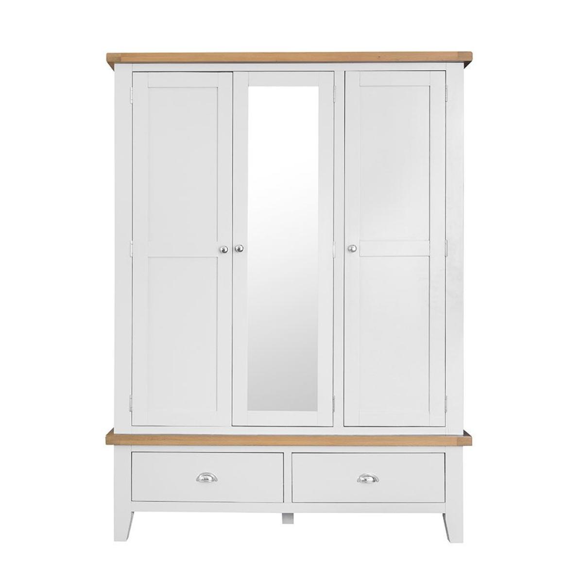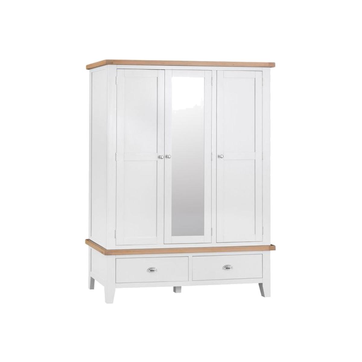 Our Tetbury 3 Door Wardrobe has an abundance of space for you to hang your clothes and store your accessories. With two practical draws and useful mirrored middle door, this wardrobe is painted in a soft white colour with complimentary chrome handles. Team with the rest of the Tetbury bedroom collection to complete the look.