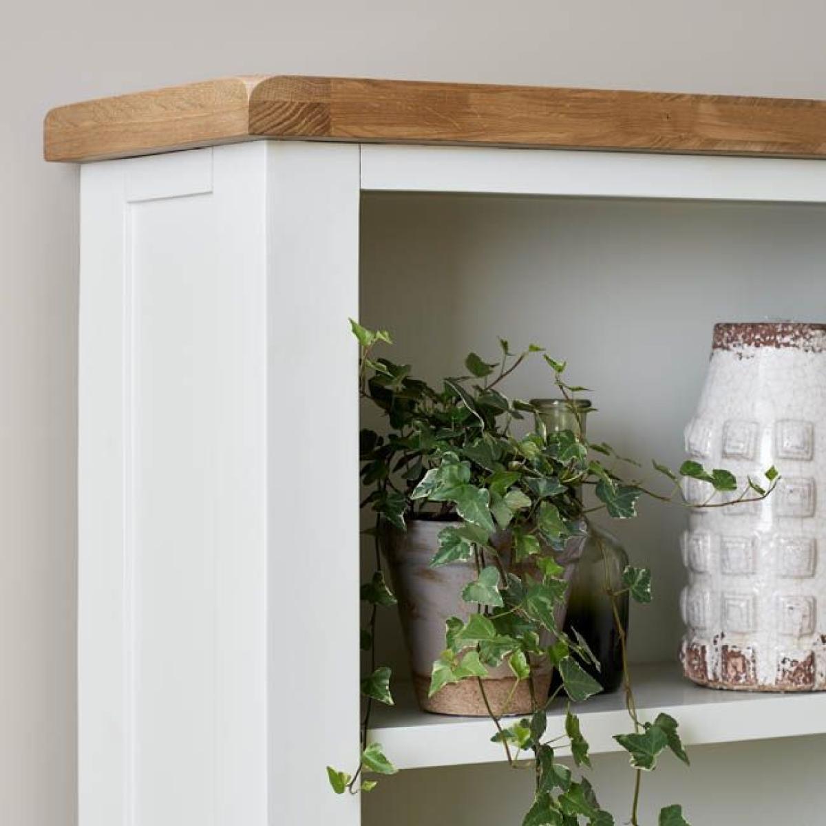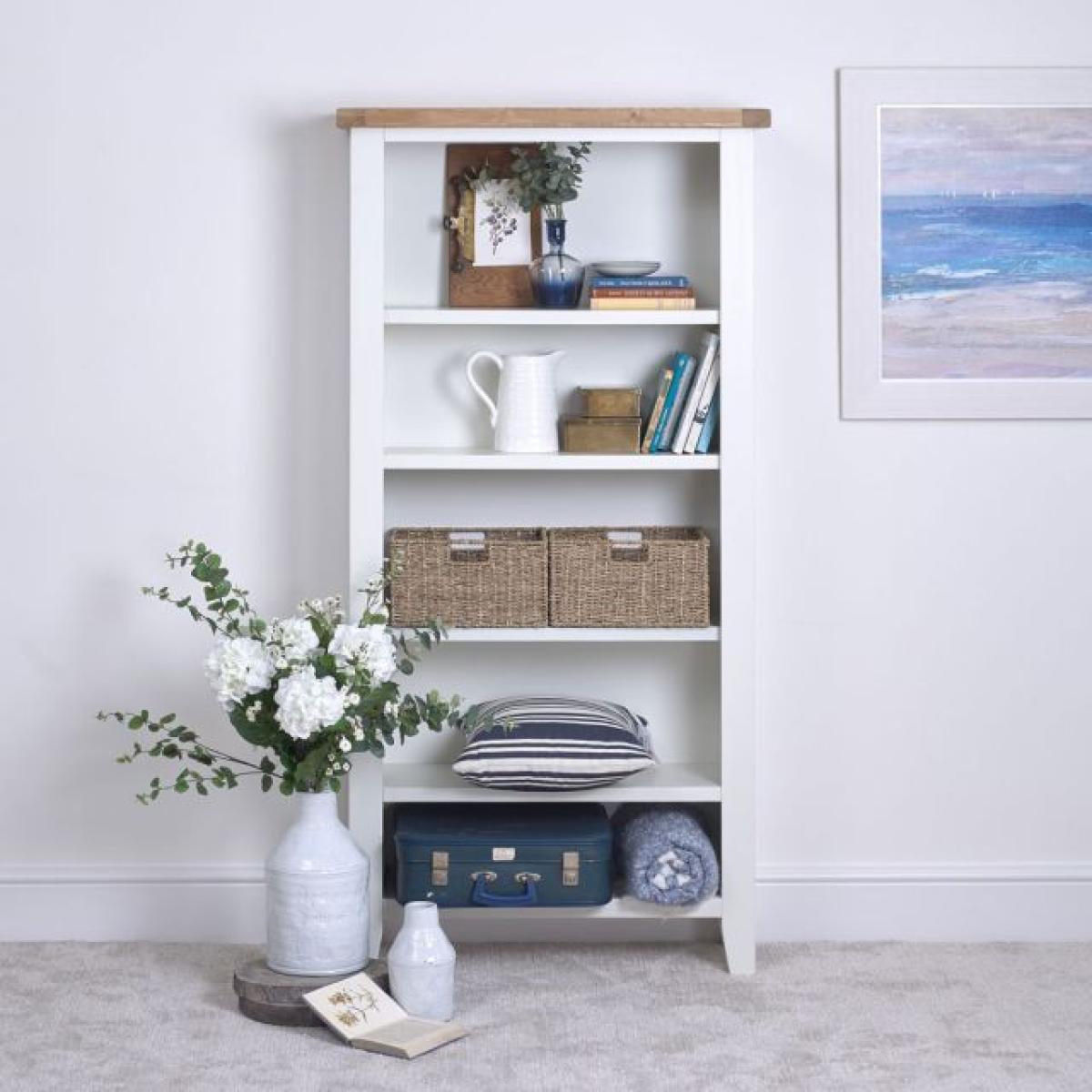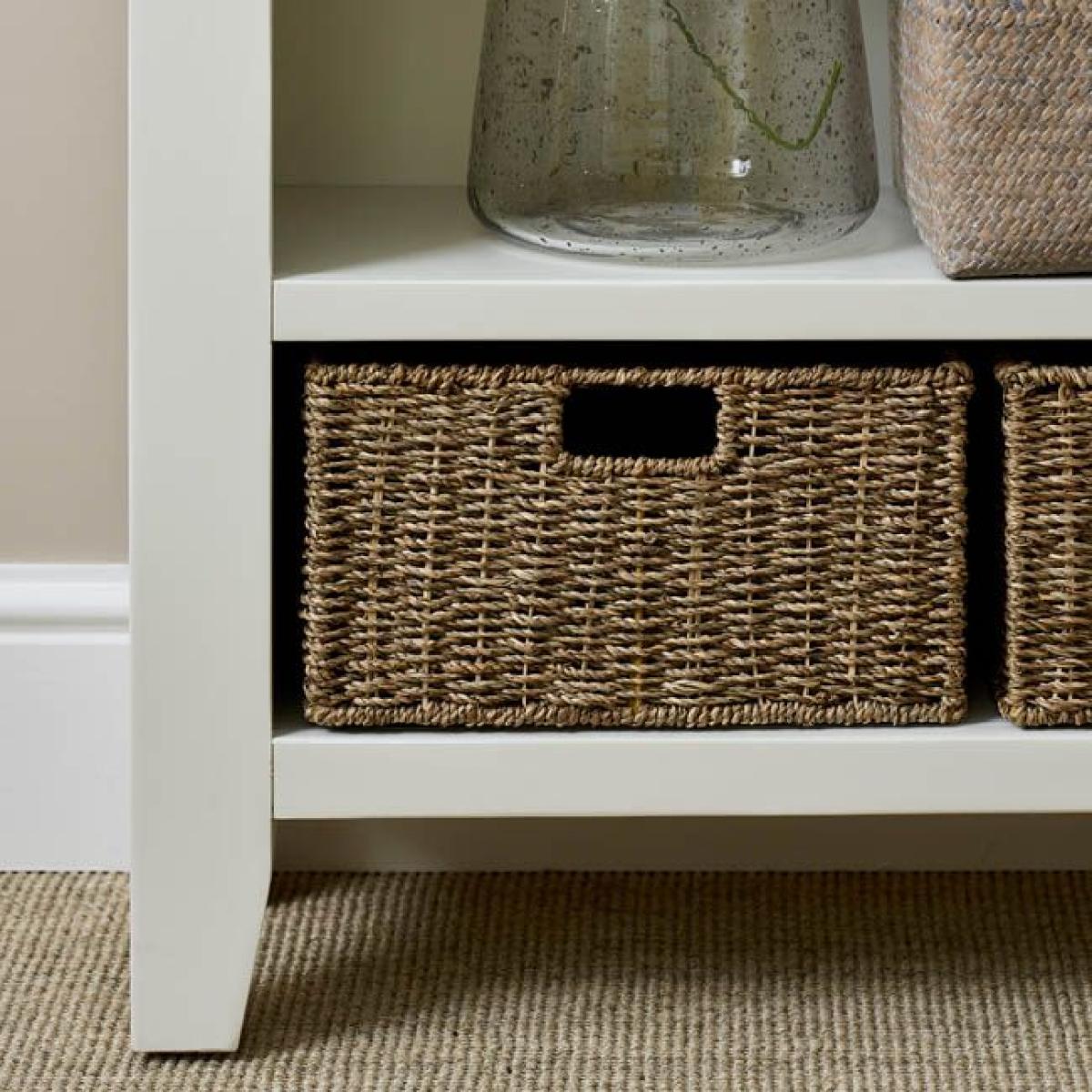 A home without a bookcase is like an unfinished novel. Beautifully crafted from oak and painted in a soft white colour, the versatile Tetbury large. White bookcase. Stands tall, ready to hold plenty of your favourite books and displaying your favourite collectibles on its sturdy shelves. Featuring a contrasting bare oak top, this tall white bookcase comprises four shelves plus a bottom shelf with two wicker baskets made from seagrass. The Tetbury large white bookcase will add a hint of coastal charm to your home. Team with the rest of the Tetbury collection to complete your look. Dimensions W90cm x D30cm x H180cm.