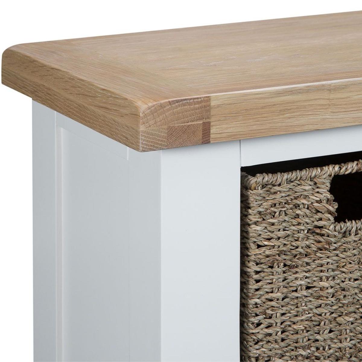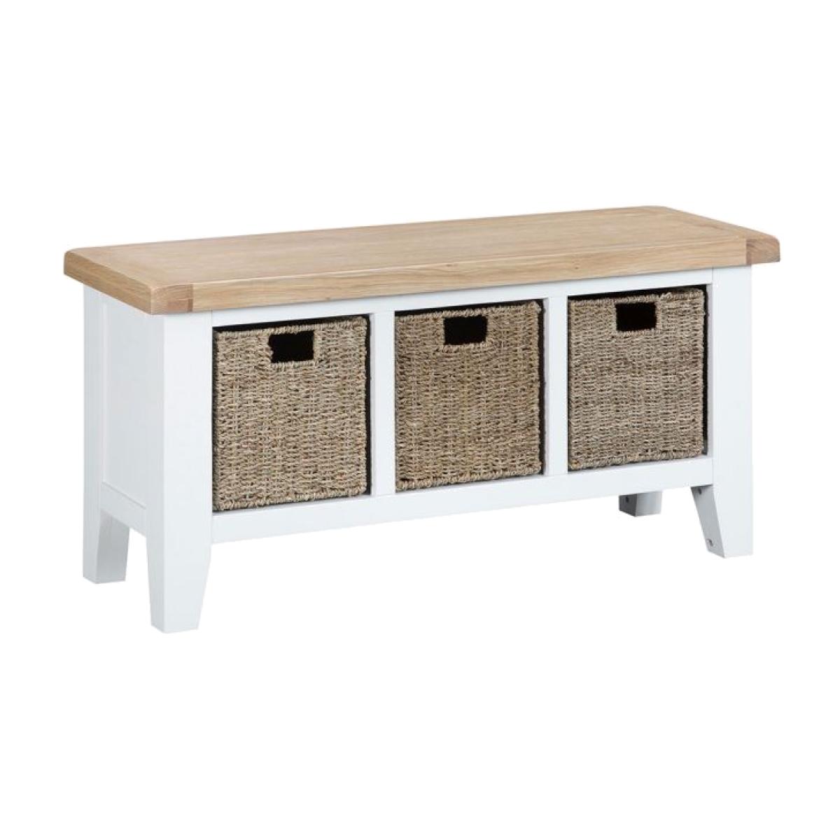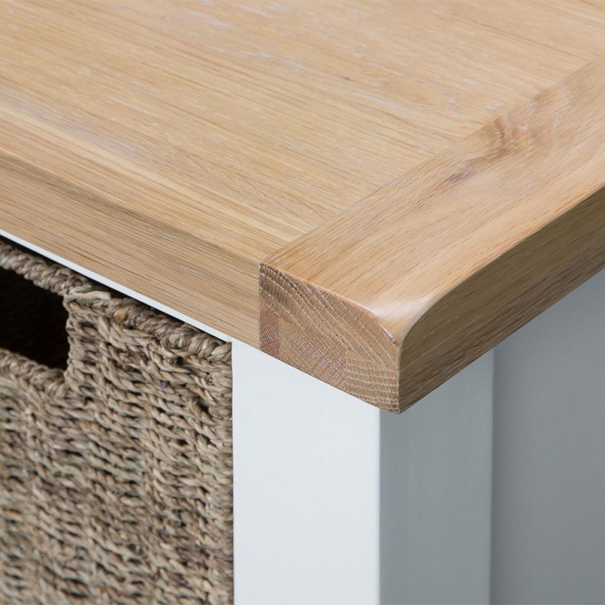 This superb Tetbury Large Hall Bench is beautifully painted in a soft white colour, adding shabby chic appeal and style to any room the home. Boasting three gorgeous wicker drawers, ideal for storing magazines and remote controls in. And a lovely solid oak and oak veneer top, a great space to gather around with the family to play a game on a Sunday afternoon.
