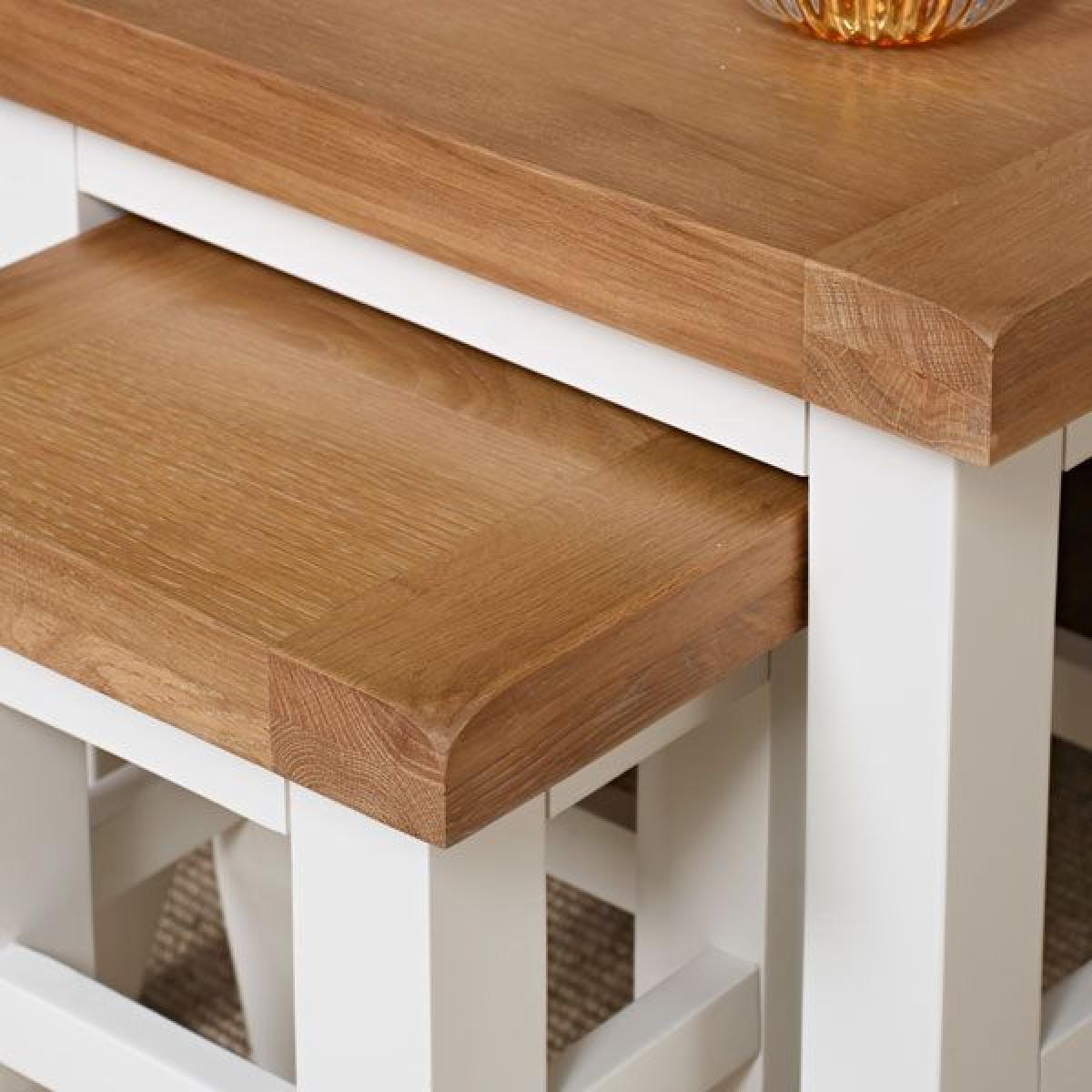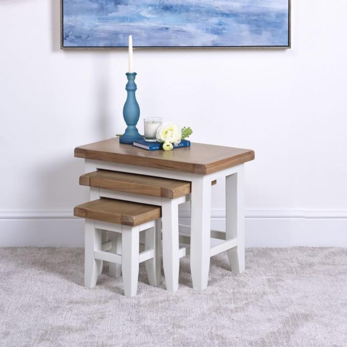 This. White nest of tables. Is so versatile, you'll wonder how you ever lived without them. Beautifully crafted from oak and painted in a soft white colour, the Tetbury nest of 3 tables features beautifully contrasting bare oak tops. The Tetbury white nest of tables will add a hint of coastal charm to your living room. Team with the rest of the Tetbury collection to complete your look. Dimensions W65cm x D38cm x H50cm.