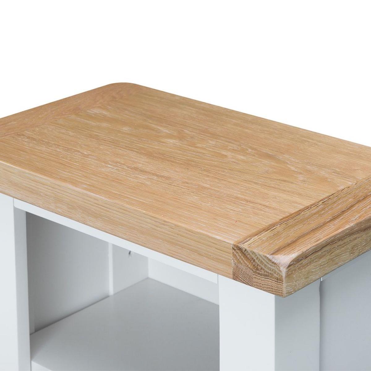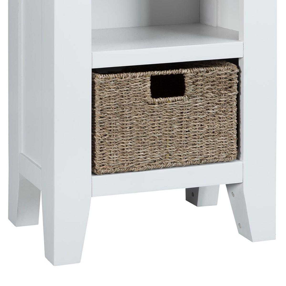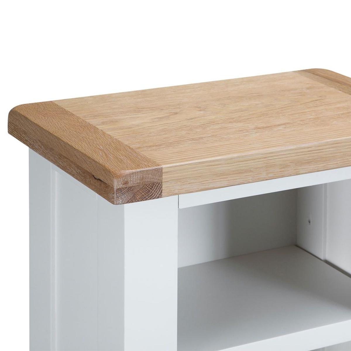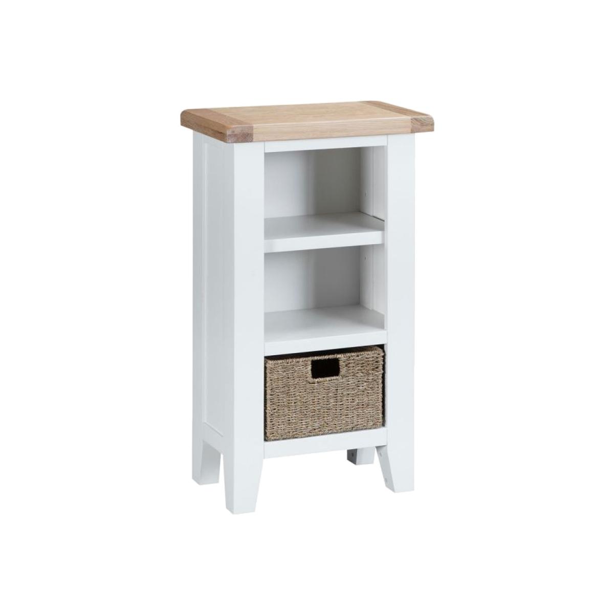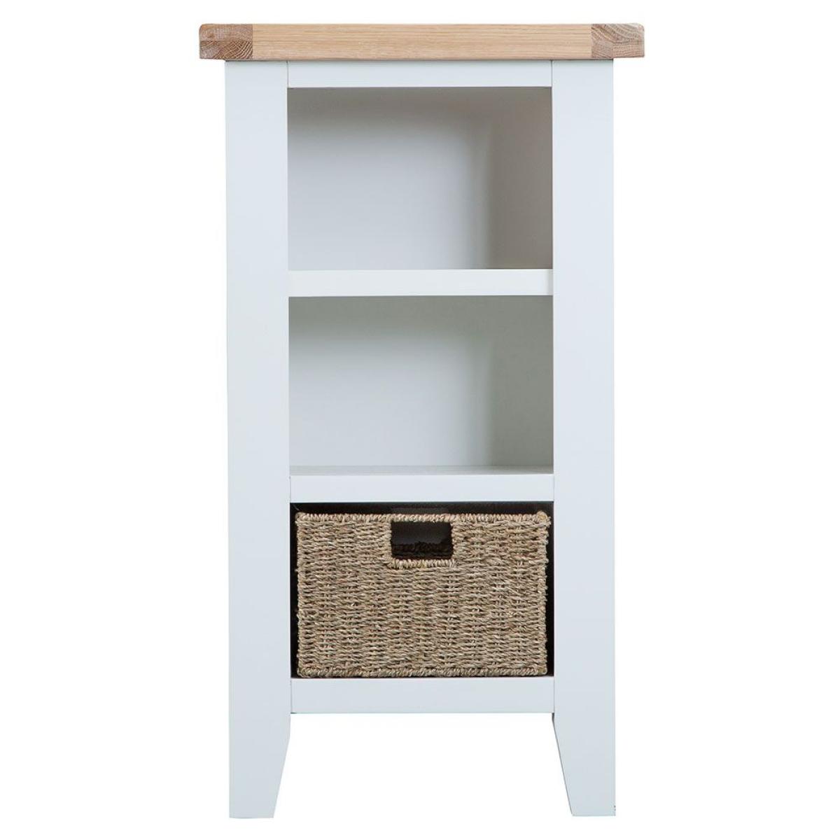 Beautifully crafted from oak and painted in a soft white colour, the Tetbury. Small Narrow Bookcase. Features a contrasting bare oak top. Comprising two narrow shelves with a lower shelf featuring a wicker basket made from seagrass, this white bookcase is perfect for keeping books or ornaments in a compact yet stylish unit. Add a hint of coastal charm to the home and team with the rest of the Tetbury collection to complete the look.