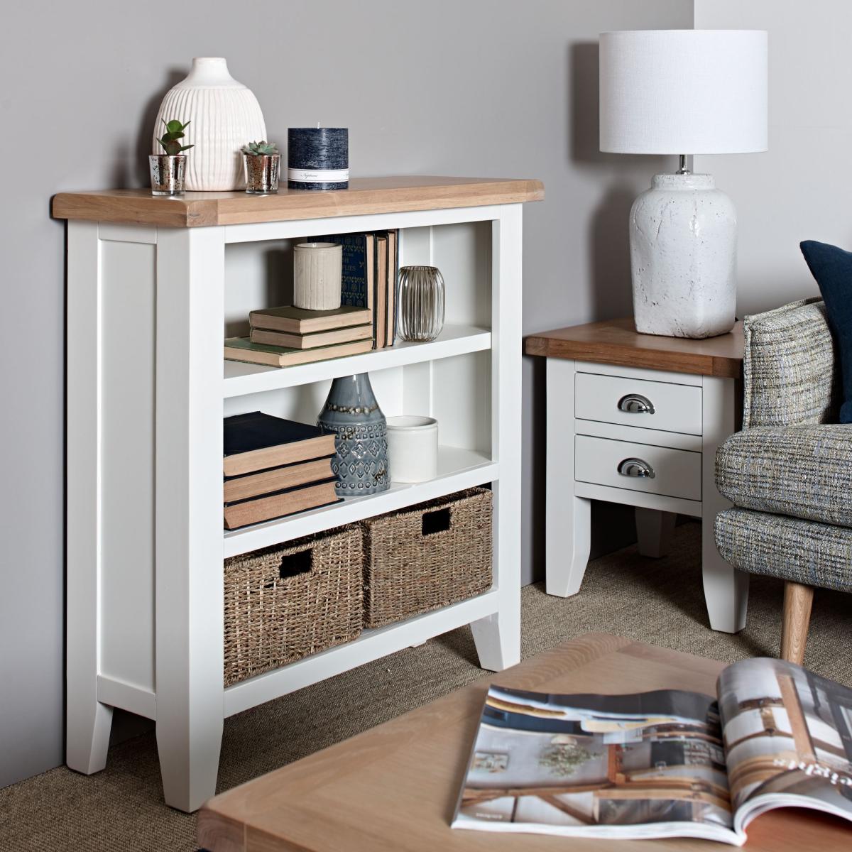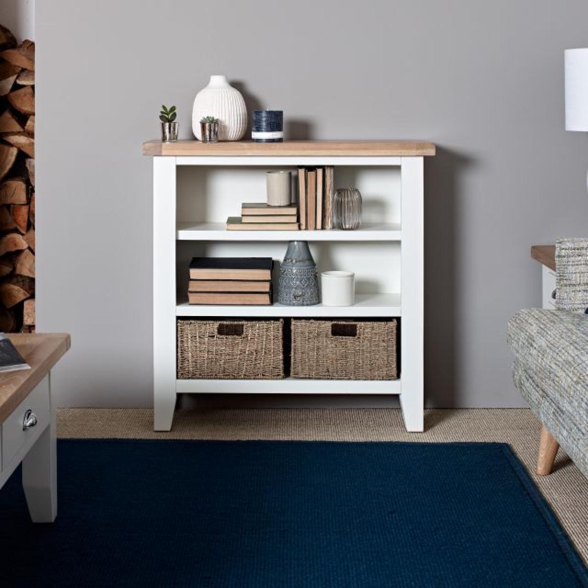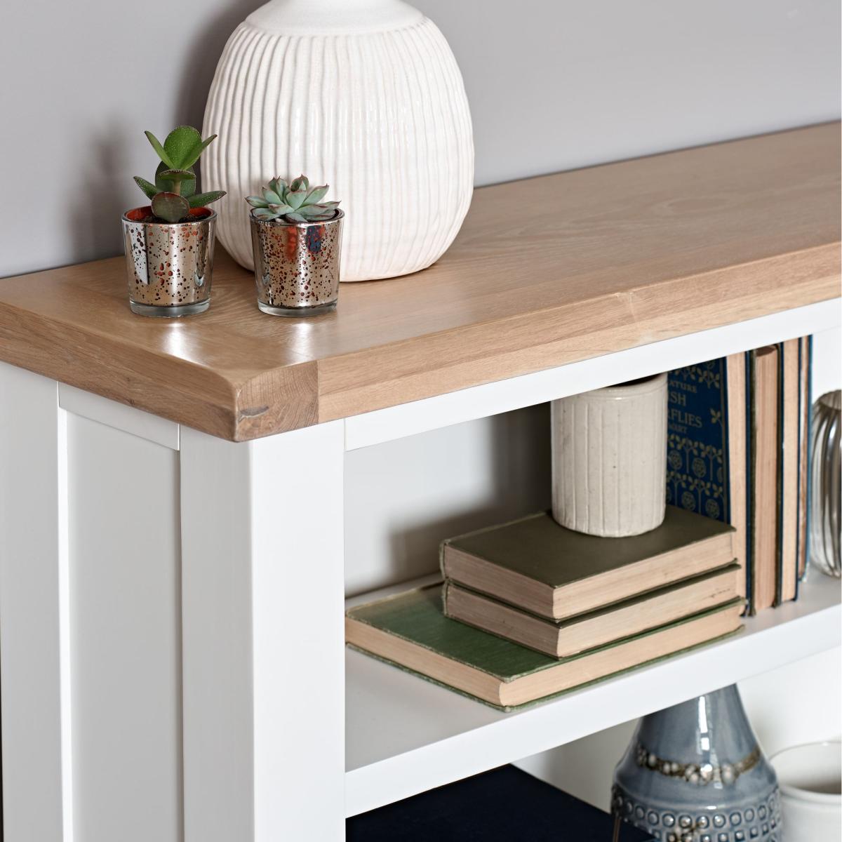 Beautifully crafted from oak and painted in a soft white colour, the Tetbury. Low wide bookcase. Features a contrasting bare oak top. Comprising two wide shelves plus a shelf below with two wicker baskets made from seagrass, this white bookcase is perfect for your library of books. The Tetbury low wide bookcase will add a hint of coastal charm to your home. Team with the rest of the Tetbury collection to complete the look.
