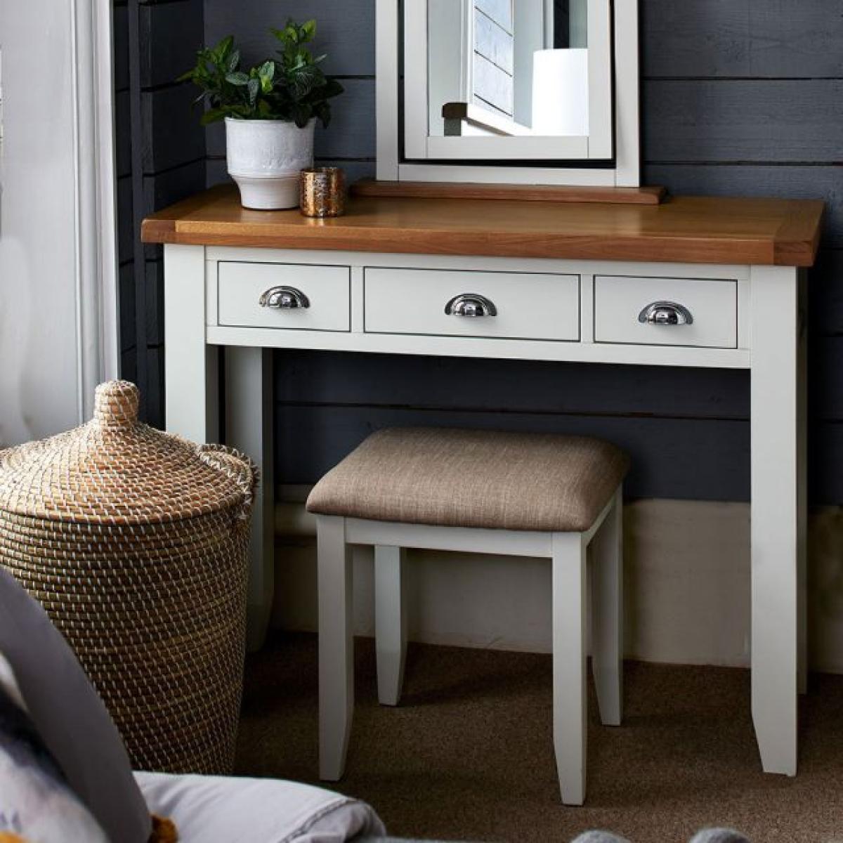 Take a seat on the Tetbury. White dressing table stool. , painted in a soft white colour with a fabric cushioned top. This white dressing table stool pairs up perfectly with the Tetbury dressing table. Team with the rest of the Tetbury white and oak bedroom furniture collection to complete the look. Dimensions W45cm x D40cm x H48cm.