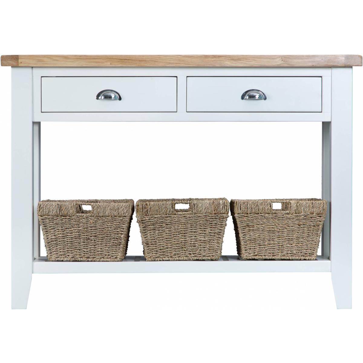 The Tetbury collection of lounge furniture comes in a stylish white painted finish with chunky gently lime-washed contrasting oak tops and chrome cup handles. Blending both classic and contemporay influences these Tetbury white painted Console Tables have a style of their own. Large Console 120cm W x 80cm H x 35cm D.