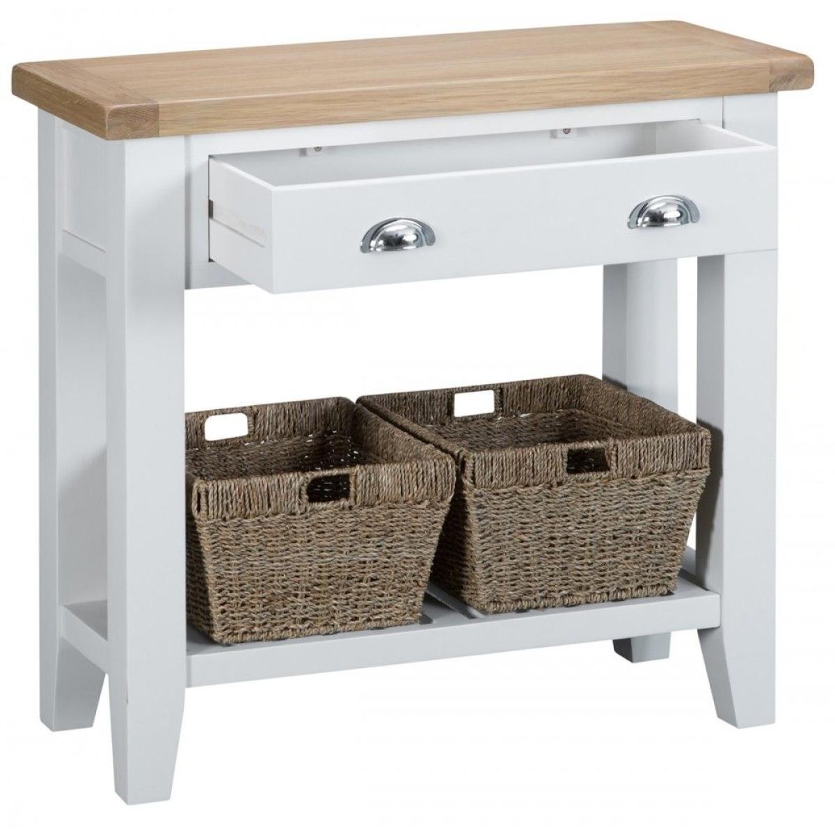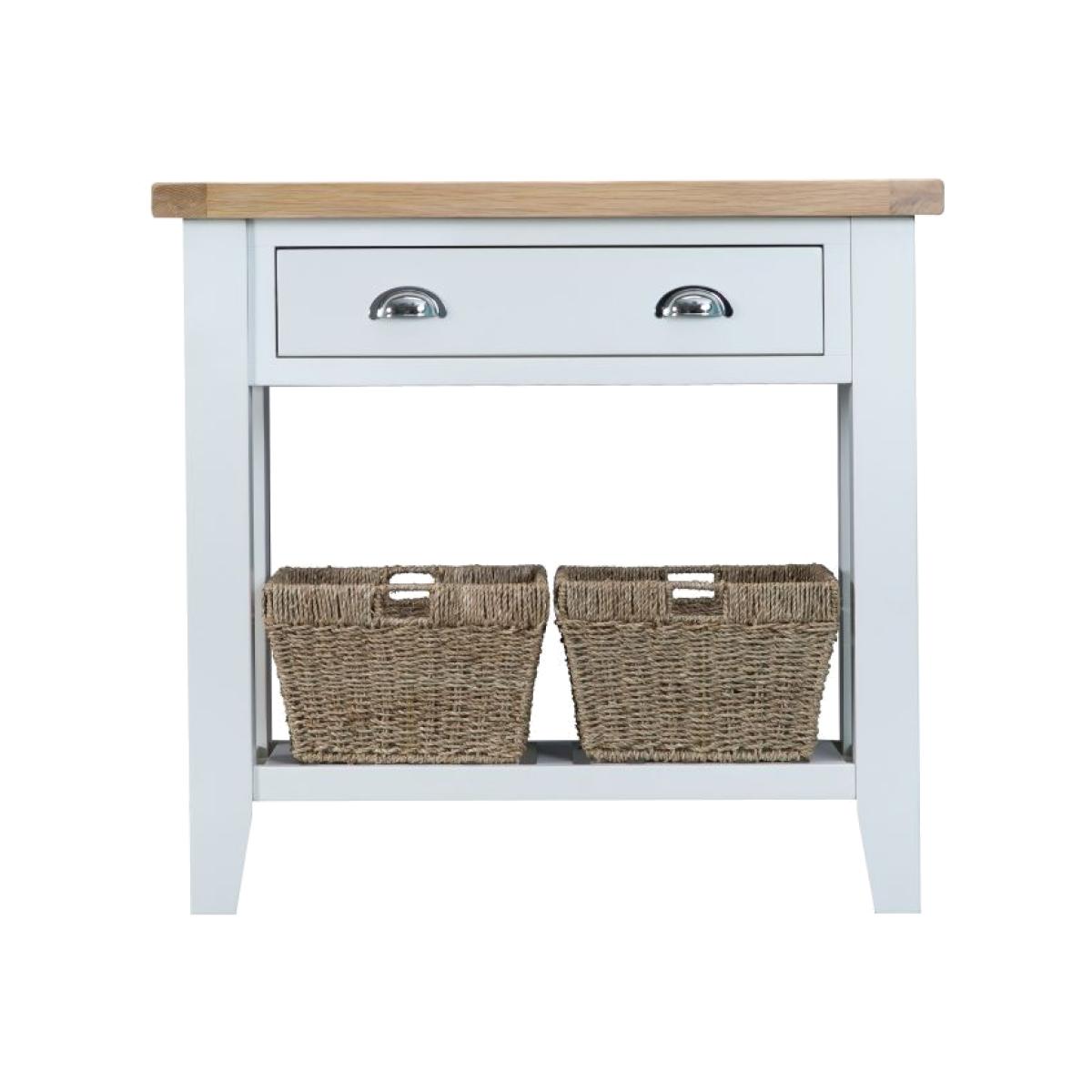 I love the simplicity and versatility of the Tetbury White Console, making it a great piece for various interiors, from cosy country cottages to sleek modern flats. Its compact size and clean lines make it ideal for hallways, living rooms, or as an elegant entryway statement. Practical styling tips include layering with a few decorative accessories like vases, table lamps, or framed photos on top, while keeping baskets below for remote controls, keys, or other daily essentials. Its light colour and natural wood top also lend themselves well to colour-coordinated accessories or textured textiles, creating a welcoming yet functional space.