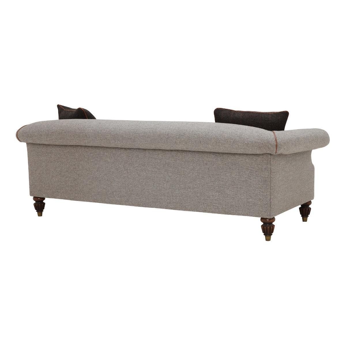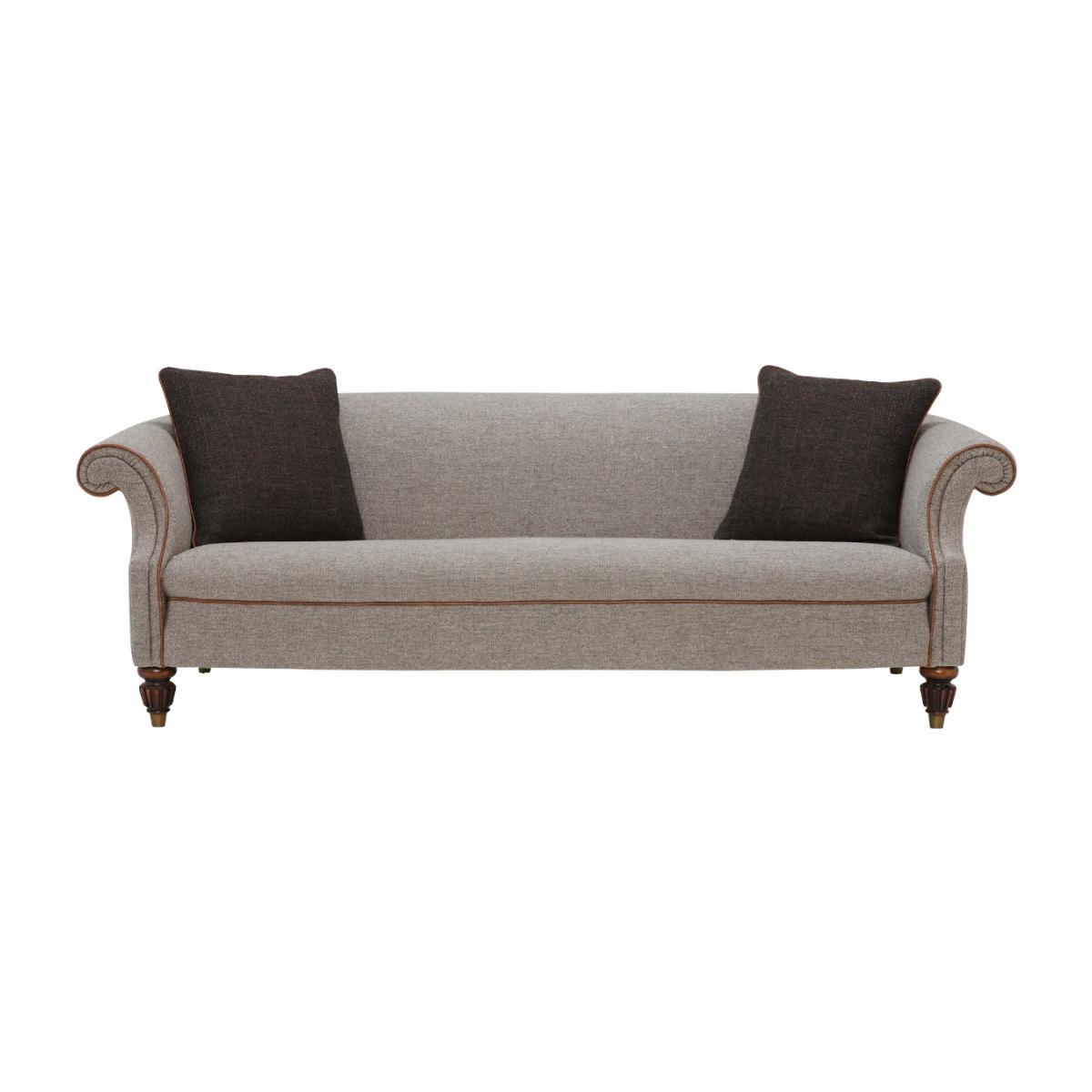 Design. Inspired by Edwardian style, this chesterfield sofa has elegant curves and simplistic lines which. Emphasizes. Its traditional beauty. The Tetrad Harris Tweed. Grand Sofa is a unique take on modern lounging, its timeless quality. Is shown through a beautiful Heather Tweed finish, a neutral beige. Colour. Scheme which will look well in a range of interior décor. Created through expert British craftmanship, this grand sofa is a. Hard-wearing. Piece that boasts a prestig. E appearance, exuding quality while typifying just what makes. British. Design great. Image shown in Heather Tweed fabric, Brompton Tan piping, Peat Herringbone scatters, and finished with Antique Brass Ferrule feet.