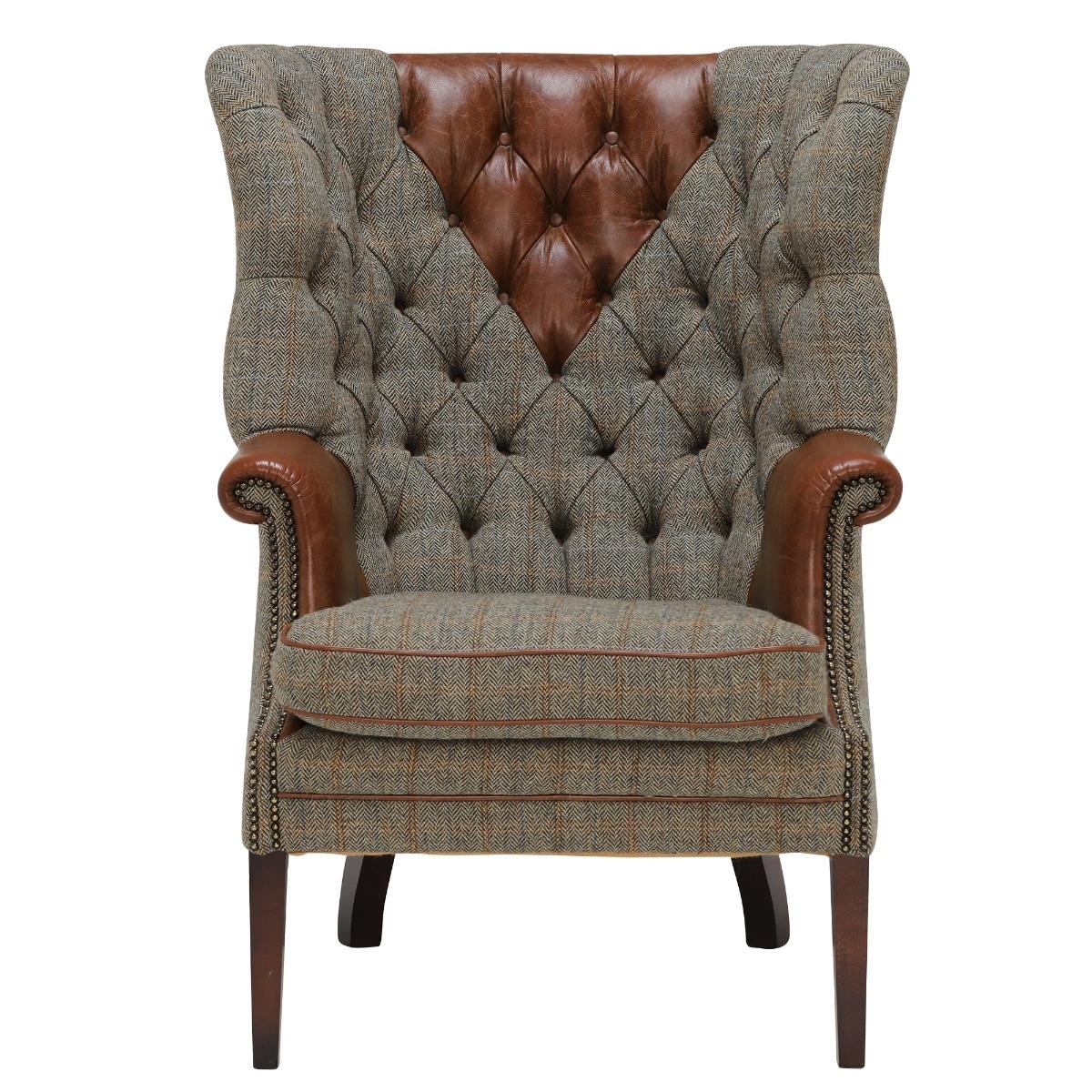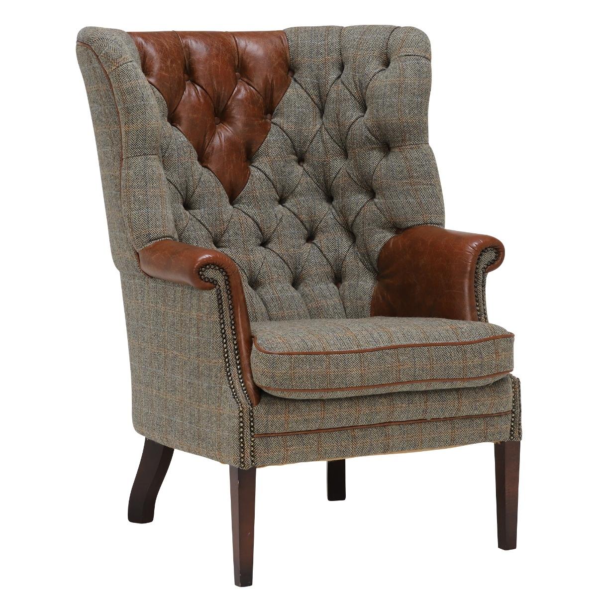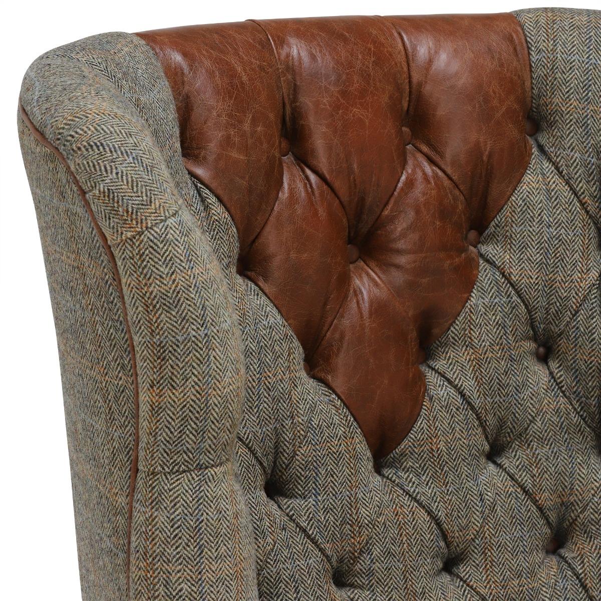 The Harris Tweed Mackenzie Chair has a classic wing back design which is sure to add charm to any space.  Crafted from genuine Harris Tweed and quality produced hide to create a contrasting look, this piece has been expertly manufactured in the UK using traditional methods.  Comprising a high webbed back and feather filled seat cushions, youll sink into comfort with ease. Scrolled arms with hand studded features offer a classy detail that adds to the charm of the Mackenzie.  Its statement deep button back emphasizes the English heritage crafted into this piece and will add plenty of character to your living room.   Image shows Bracken Herringbone tweed fabric, Bromptan Tan hide, and polished hardwood legs.