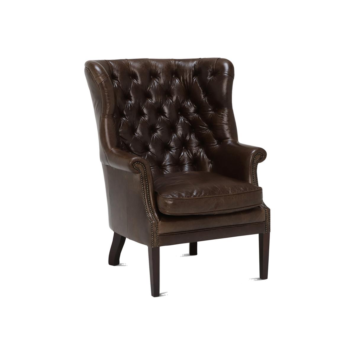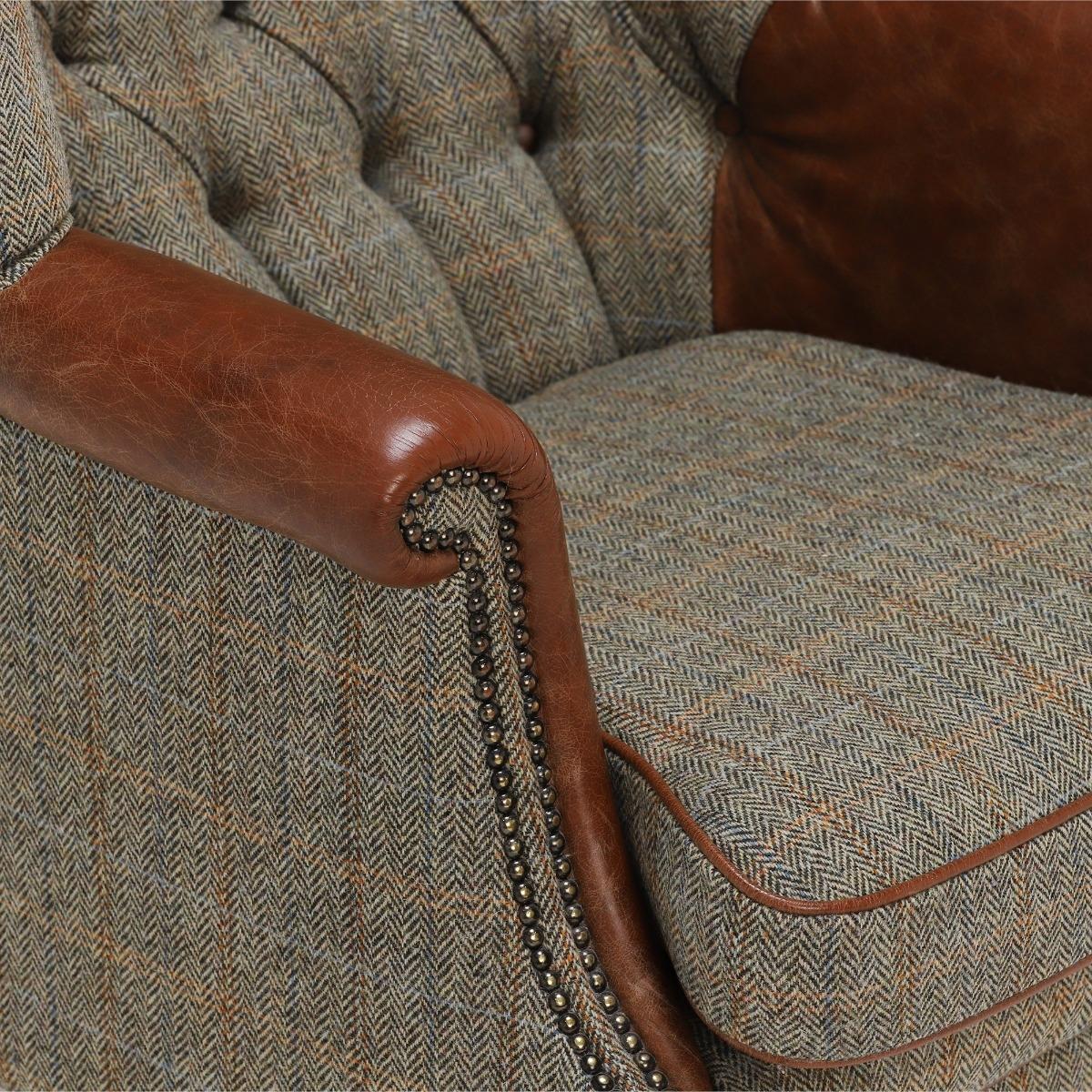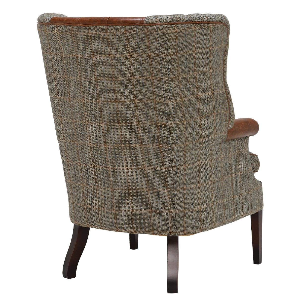 The Harris Tweed Mackenzie Chair has a classic wing back design which is sure to add charm to any space.  Crafted from genuine Harris Tweed and quality produced hide to create a contrasting look, this piece has been expertly manufactured in the UK using traditional methods.  Comprising a high webbed back and feather filled seat cushions, youll sink into comfort with ease. Scrolled arms with hand studded features offer a classy detail that adds to the charm of the Mackenzie.  Its statement deep button back emphasizes the English heritage crafted into this piece and will add plenty of character to your living room.   Image shows Bracken Herringbone tweed fabric, Bromptan Tan hide, and polished hardwood legs.