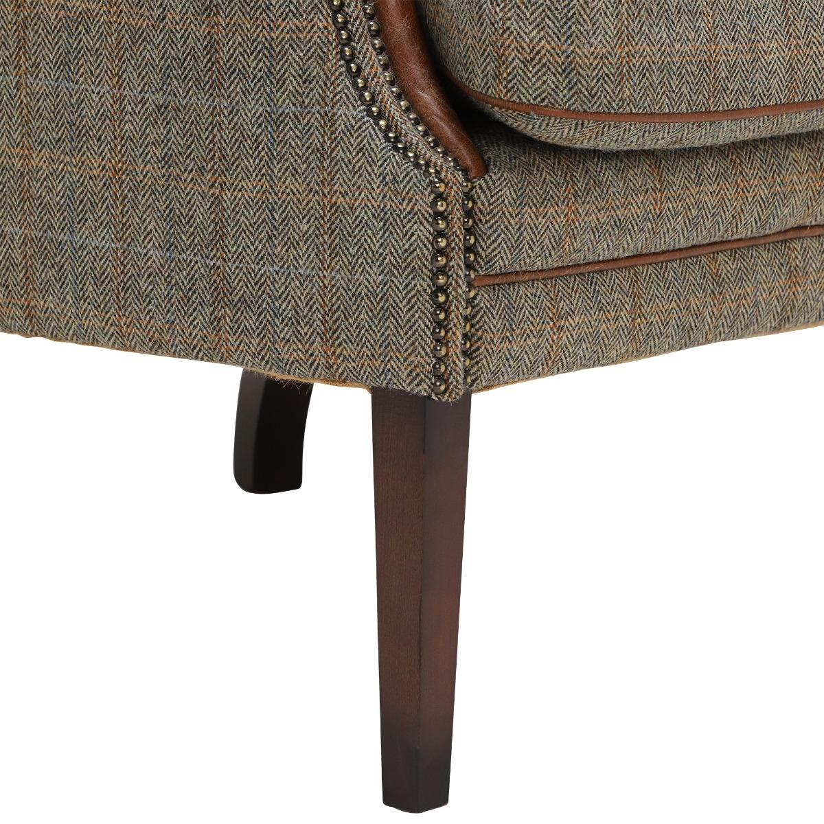 The Harris Tweed Mackenzie Chair has a classic wing back design which is sure to add charm to any space.  Crafted from genuine Harris Tweed and quality produced hide to create a contrasting look, this piece has been expertly manufactured in the UK using traditional methods.  Comprising a high webbed back and feather filled seat cushions, youll sink into comfort with ease. Scrolled arms with hand studded features offer a classy detail that adds to the charm of the Mackenzie.  Its statement deep button back emphasizes the English heritage crafted into this piece and will add plenty of character to your living room.   Image shows Bracken Herringbone tweed fabric, Bromptan Tan hide, and polished hardwood legs.