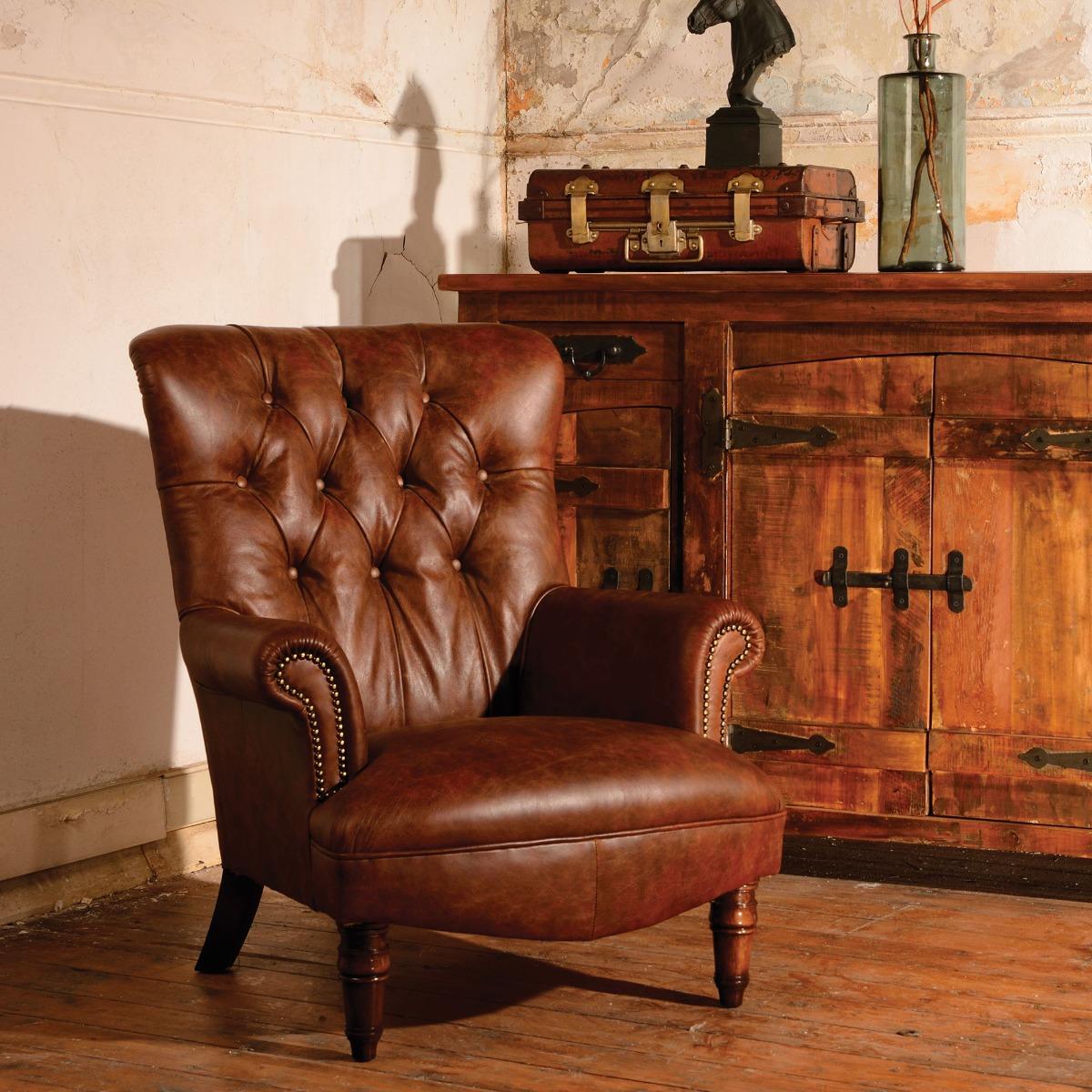 I’m a fan of the Regent armchair because its rich tan leather and button-back tweed blend hard-wearing materials with a tailored look. The turned legs and brass studs give it just enough detail to sit comfortably in both contemporary country homes and more traditional studies. Pair it with a wool blanket draped over one arm and a low-slung side table in dark oak. A textured cushion in muted greens or rusts will tie into the tweed, while a warm-metal floor lamp nearby keeps the corner inviting without over-styling.