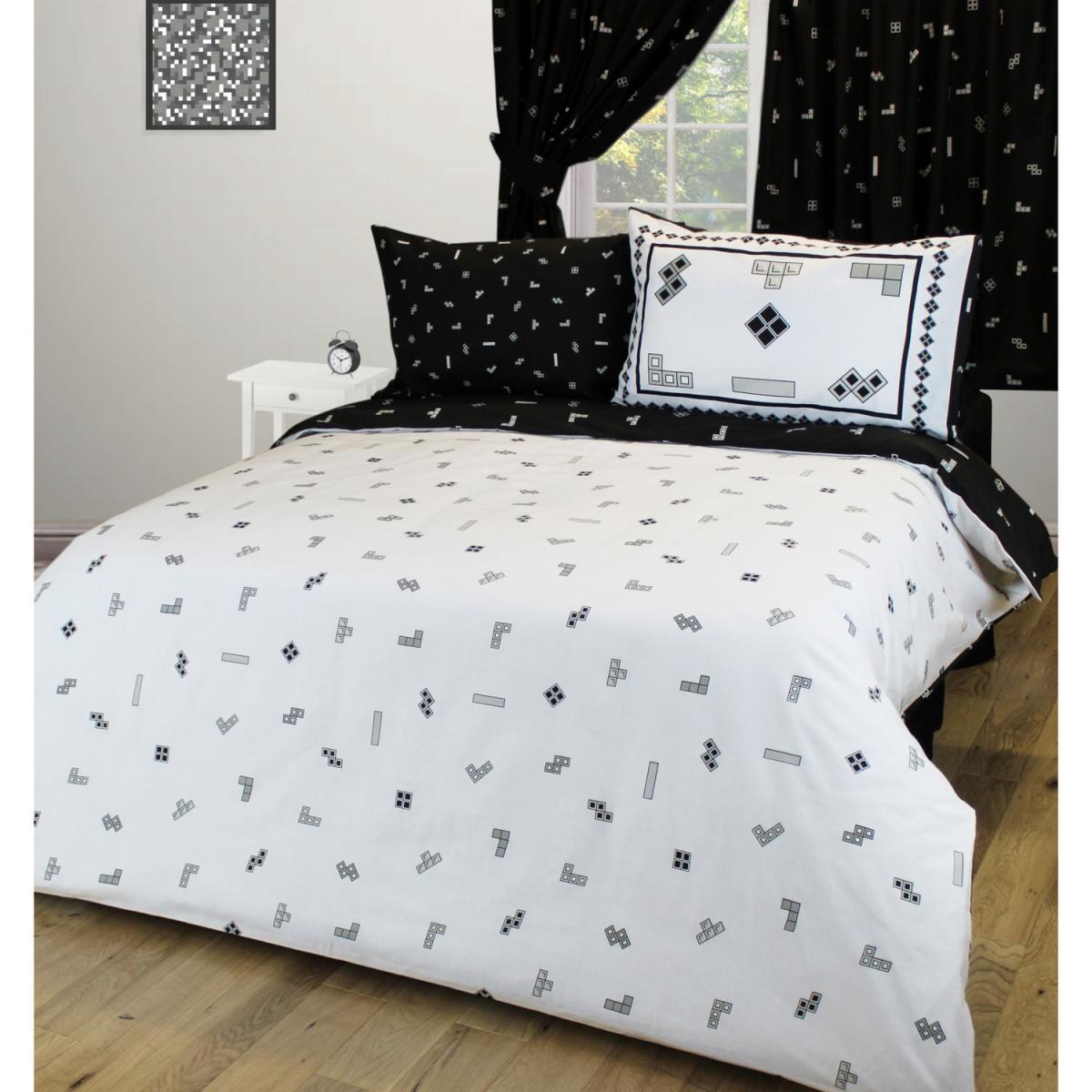 Funky Tetris print bedding range, with scattered Tetriminos. Reversible design with a white ground on one side and a black ground on the other side. Matching accessories such as curtains, cushions, table cloths and bean bags are available separately.