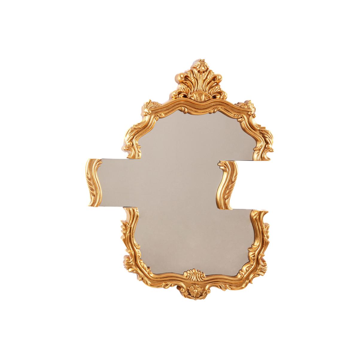 De-constructed image... A very strong visual impact for this troubling, fascinating mirror from Italian designer, Giampero Romano. This classically shaped mirror is interspersed with an offset band: the central part seems to have been pushed as if by magic. This asymmetrical, quirky position opens a dreamlike window into another dimension. The Tetris mirror has a dual personality, presenting a discrepancy between its eccentric cutout and the very classic style of the frame with its golden mouldings. The other feature of this mirror is the use of a surprising material. The frame seems to be made of wood: in fact, it’s made of expanded polyurethane. Lightweight, this plastic material perfectly imitates wood.