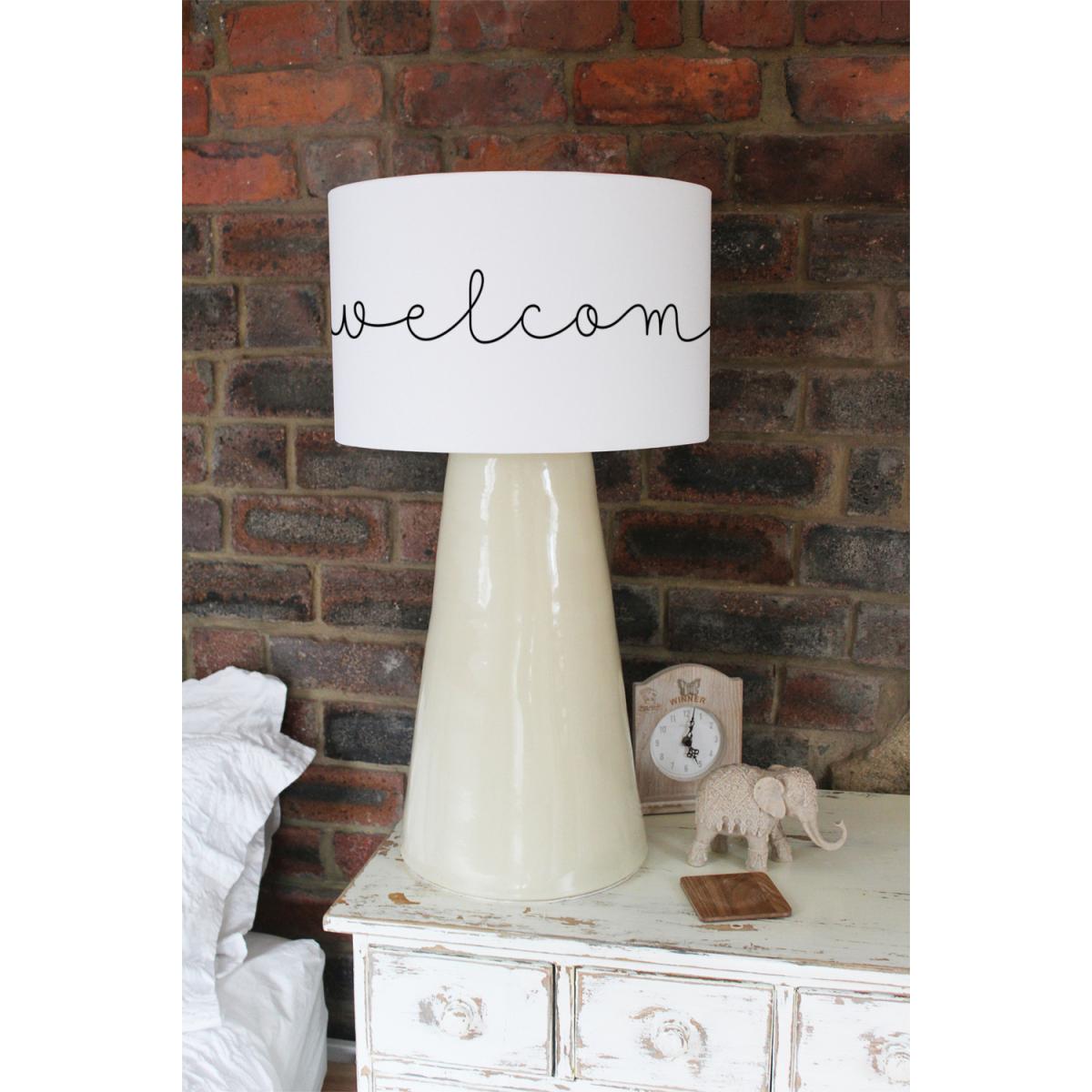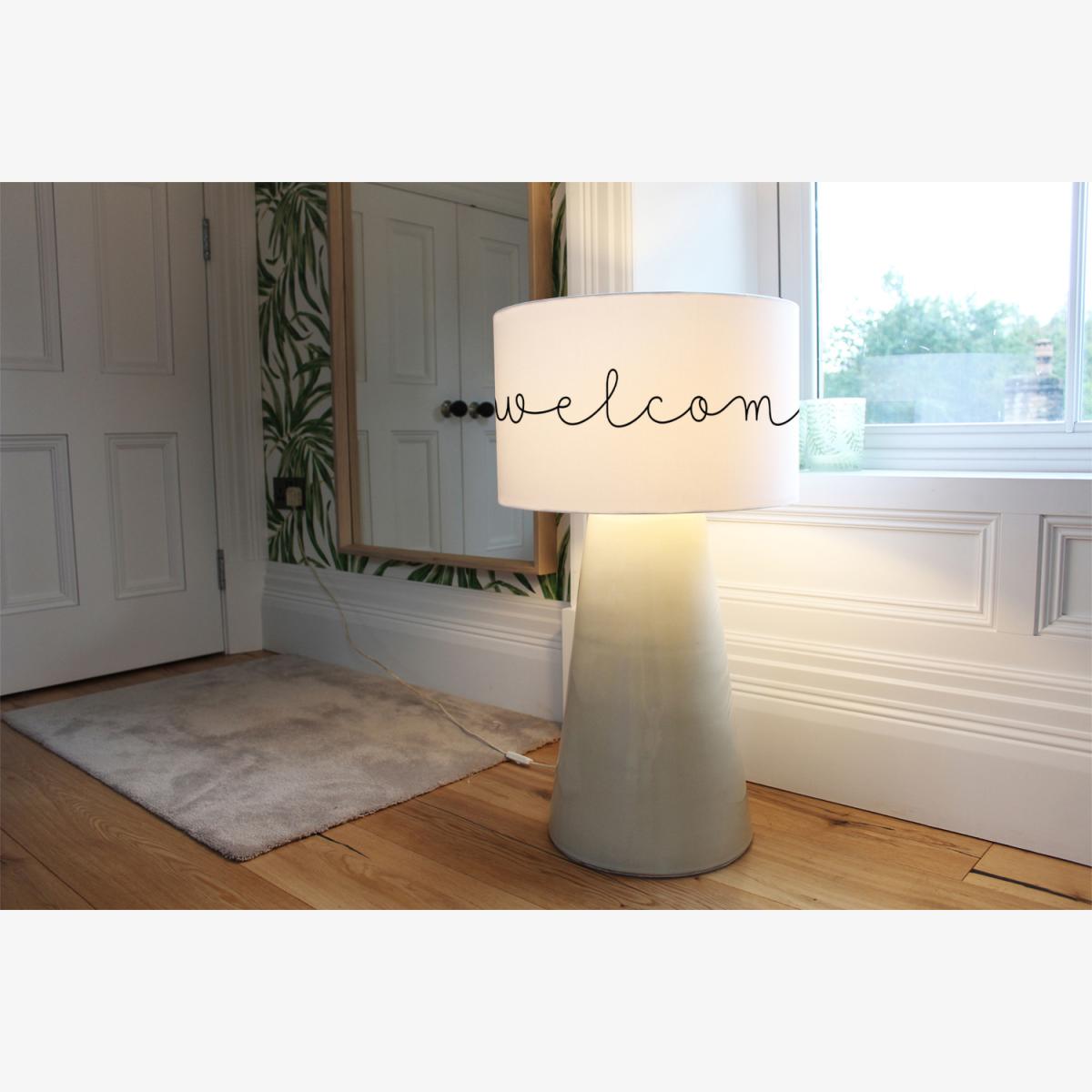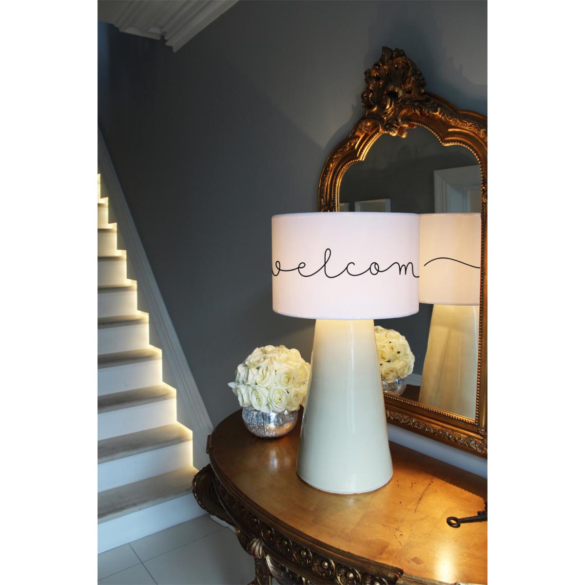I love this lamp because of its clean, modern look and versatile design. The white shade with the "welcome" script adds a warm, inviting touch, making it ideal for hallways, living rooms, or even bedrooms. The 40cm size is practical, fitting easily into various settings without overpowering the space. It works especially well in contemporary or Scandi-inspired interiors, where its simplicity complements minimalist furniture and neutral palettes. For styling, consider placing it on a side table or near an entryway to enhance the welcoming vibe, and pair it with other textured or natural materials to create a balanced, stylish look.