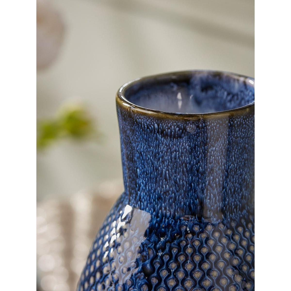 I love this big ceramic vase because of its textured surface and striking blue glaze, which adds a modern yet timeless touch to a space. It works wonderfully in contemporary, minimalist, or even eclectic interiors, where its bold presence can serve as a statement piece. To style it effectively, consider keeping it simple-pair it with a few long-stemmed greenery or dried stems for an effortless look, and place it on a sideboard or console where it can be appreciated without overwhelming the space. Its size and texture also make it versatile enough to work on a shelf or as a standalone accent, adding depth and interest to your decor.