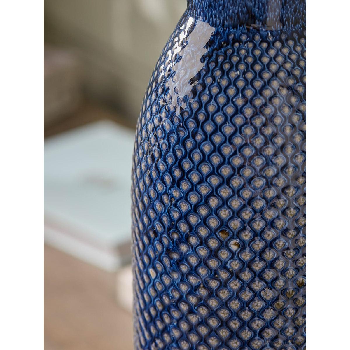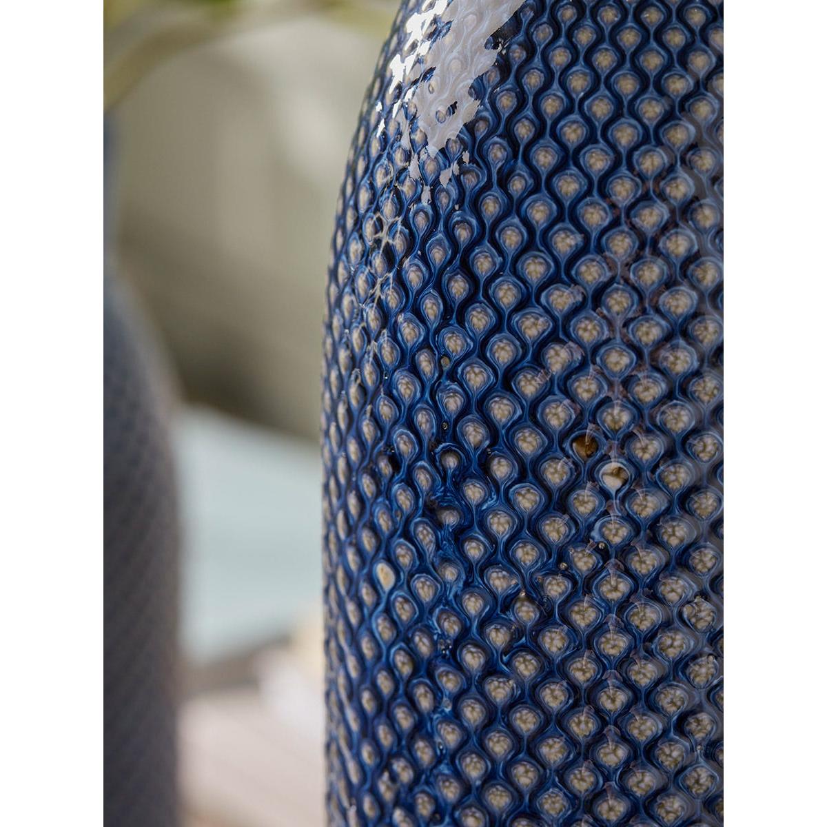 Simple and clean lines create a bottle shaped vase that oozes elegance and sophistication in your home. Crafted from a delicate porcelain, the dainty dotted textural detailing adds intricacy and interest to the vase. Blue tones surround the vase, perfect for a home that sits within our French Blue collection and creates a wonderful contrast to the bright colours of your florals and greenery, for a fresh and inspiring finish to your home. Also available in a smaller size.