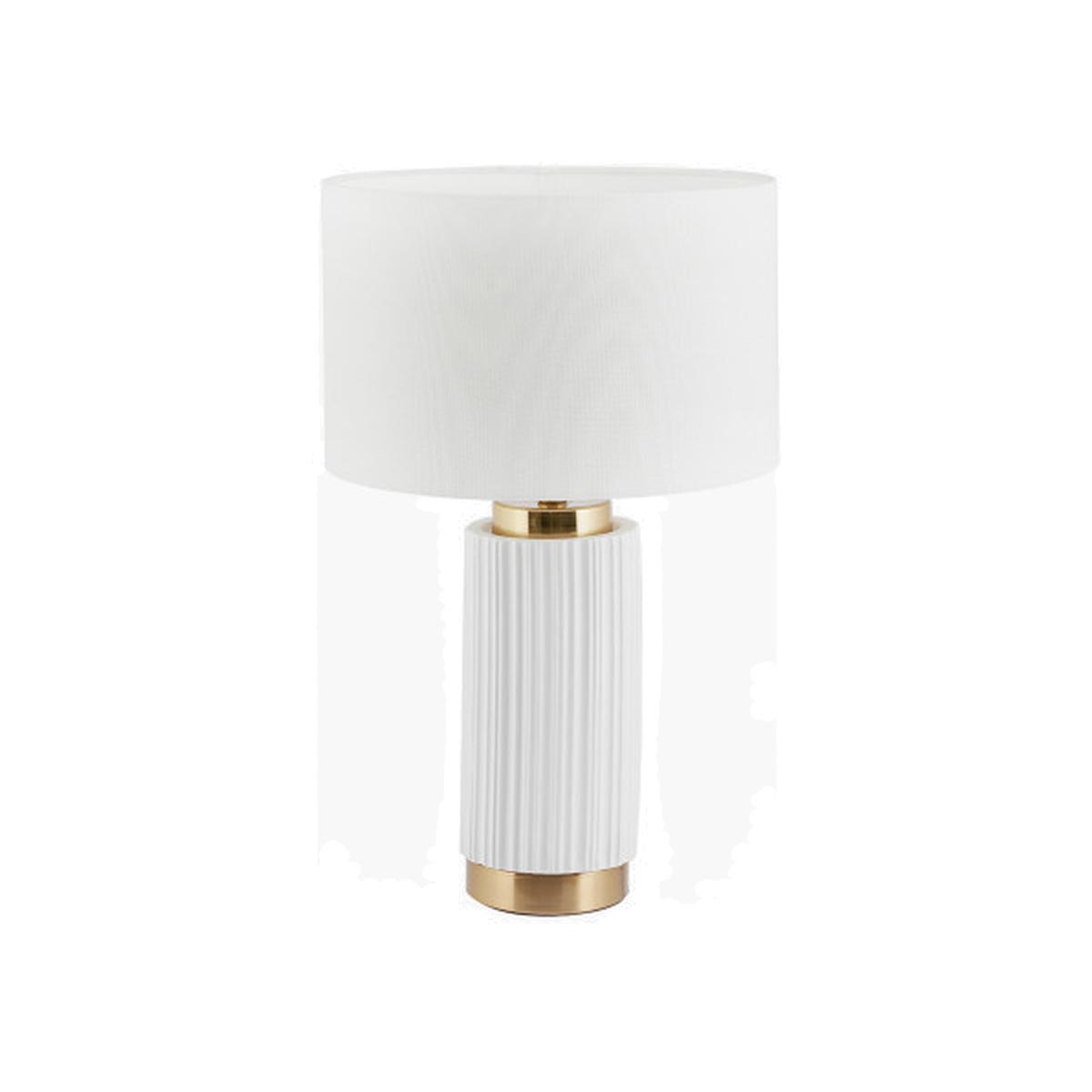 Simple and Elegant. This column ceramic table lamp is finished with a ridged detailing and white colourway. Encased top and bottom with a contrasting gold metal and finished with a faux cotton self lined white shade for ultimate understated glamour. Also available in other colours.