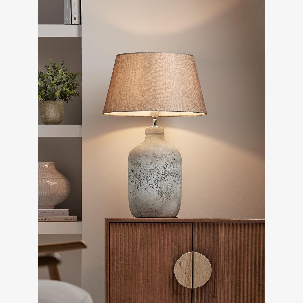 This table lamp features a broad bottle shaped concrete base with a toning grey linen lampshades. With no two the same, there’s much to discover in the changing patterns of this textural piece which will add stylish illumination to any corner of your home. Discover how to create the perfect lighting scheme for your home using our Lighting Buying Guide.