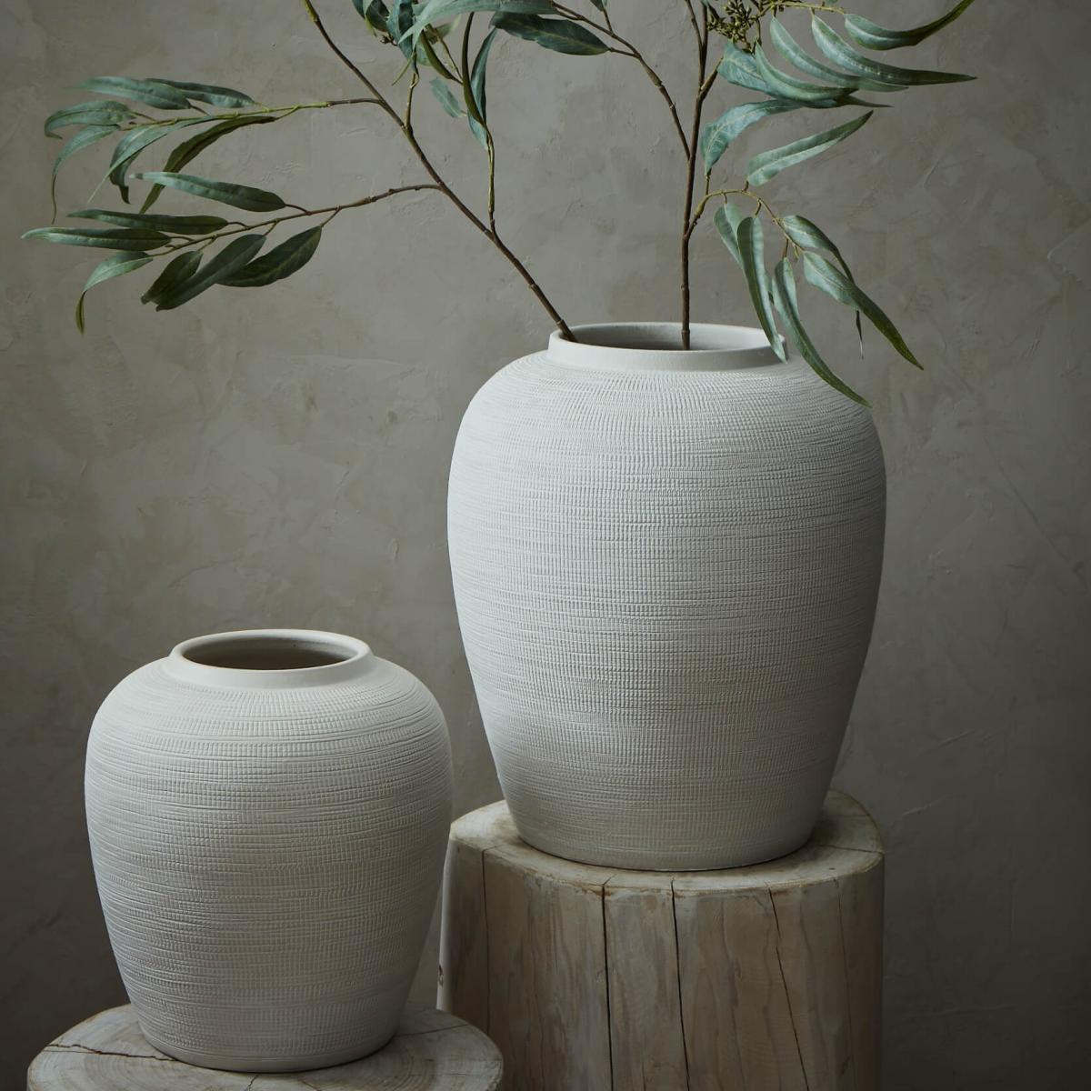 With a stunning soft cream colouration and simple shape, each of our textured cream vase is handmade and finished with a lovely subtle pattern. Now available in extra large size for greater impact or placing on the floor. This is a timeless design so no wonder its a best seller and favoured by so many of our instagram friends! Note: These vases are handmade, so each one is unique. Internally glazed we cannot guarantee water tightness so highly recommend using them for faux or dried flowers. Alternatively you can place a glass jar inside for real flowers.