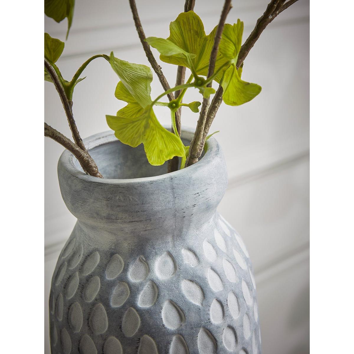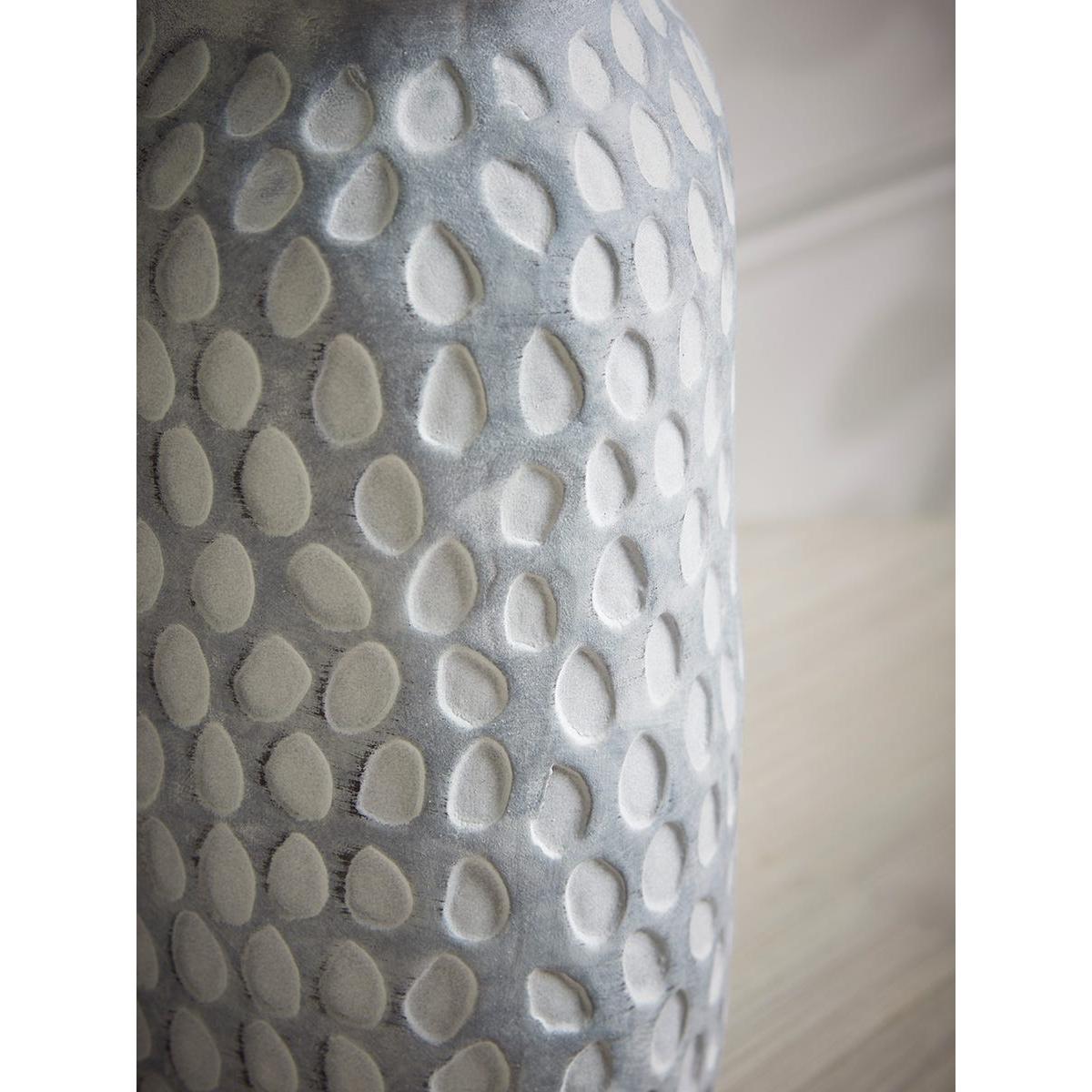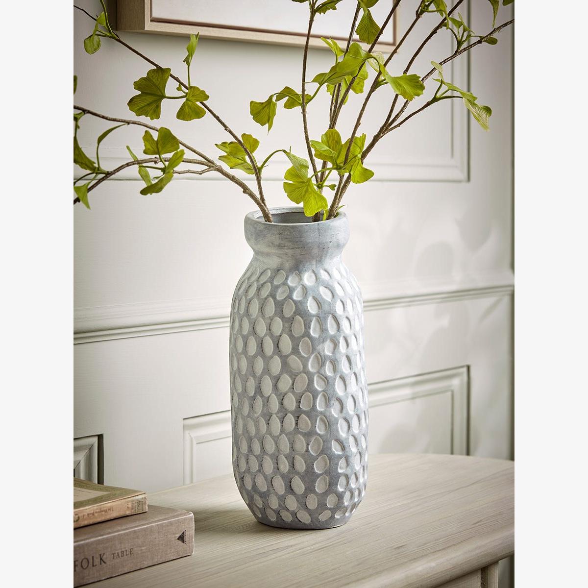 With a gently aged effect that presents an organic quality, this vase has a long bottle shape with a slightly splayed neck, ideal for taller stems and foliage. Engraved into the ceramic are delicate raindrop-like shapes, falling down the entire vase, creating a textured and dimpled effect. With enough visual interest to work as a standalone piece, its neutral tones are also perfect for holding bright and colourful faux flowers.