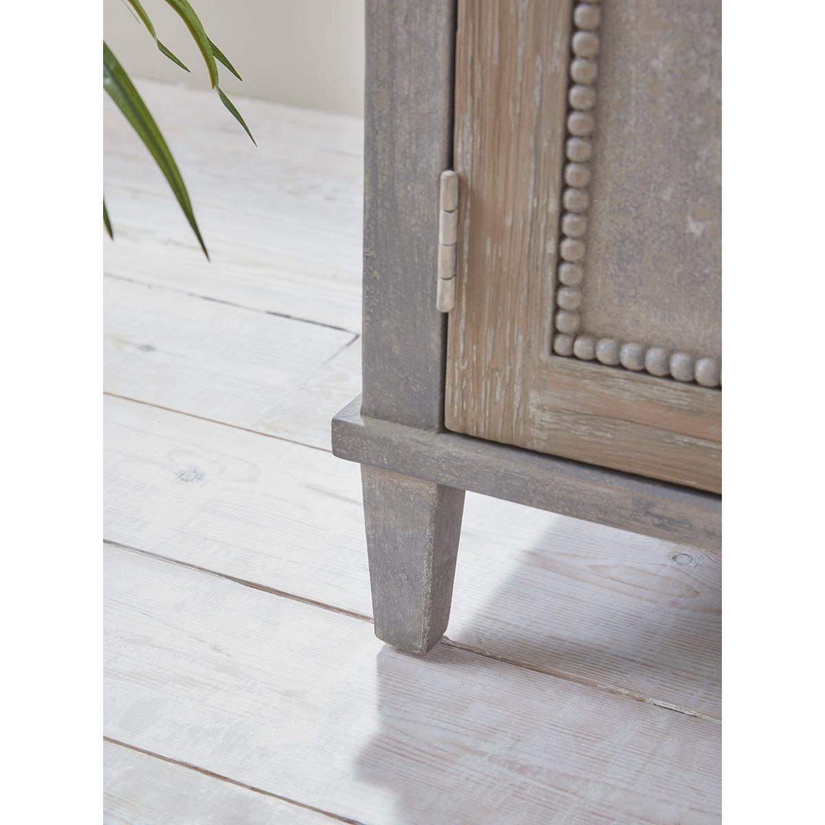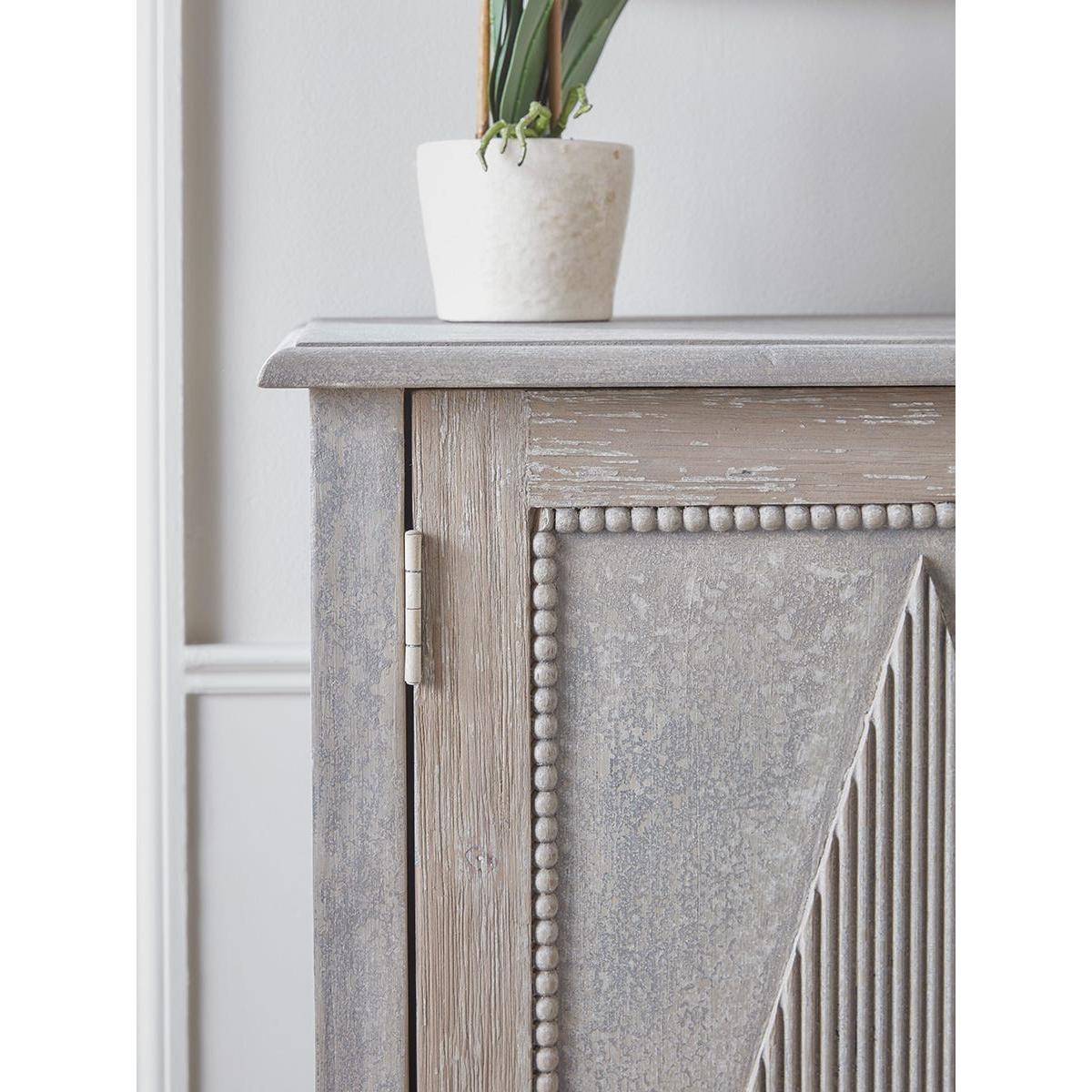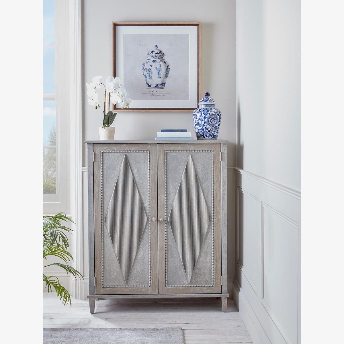 I love the texture and geometric detail of this sideboard - it adds visual interest without overwhelming a space. It works particularly well in both contemporary and coastal interiors, where the subtle patterns can complement natural materials like wood or linen. To style it effectively, consider keeping the top surface minimal with a few curated accessories, such as ceramic vases or framed prints, to highlight its craftsmanship. Practical tips include using it for storage of everyday items in a living room or hallway, while letting its design be the focal point. Its neutral tone makes it versatile enough to blend seamlessly into different colour schemes and styles.