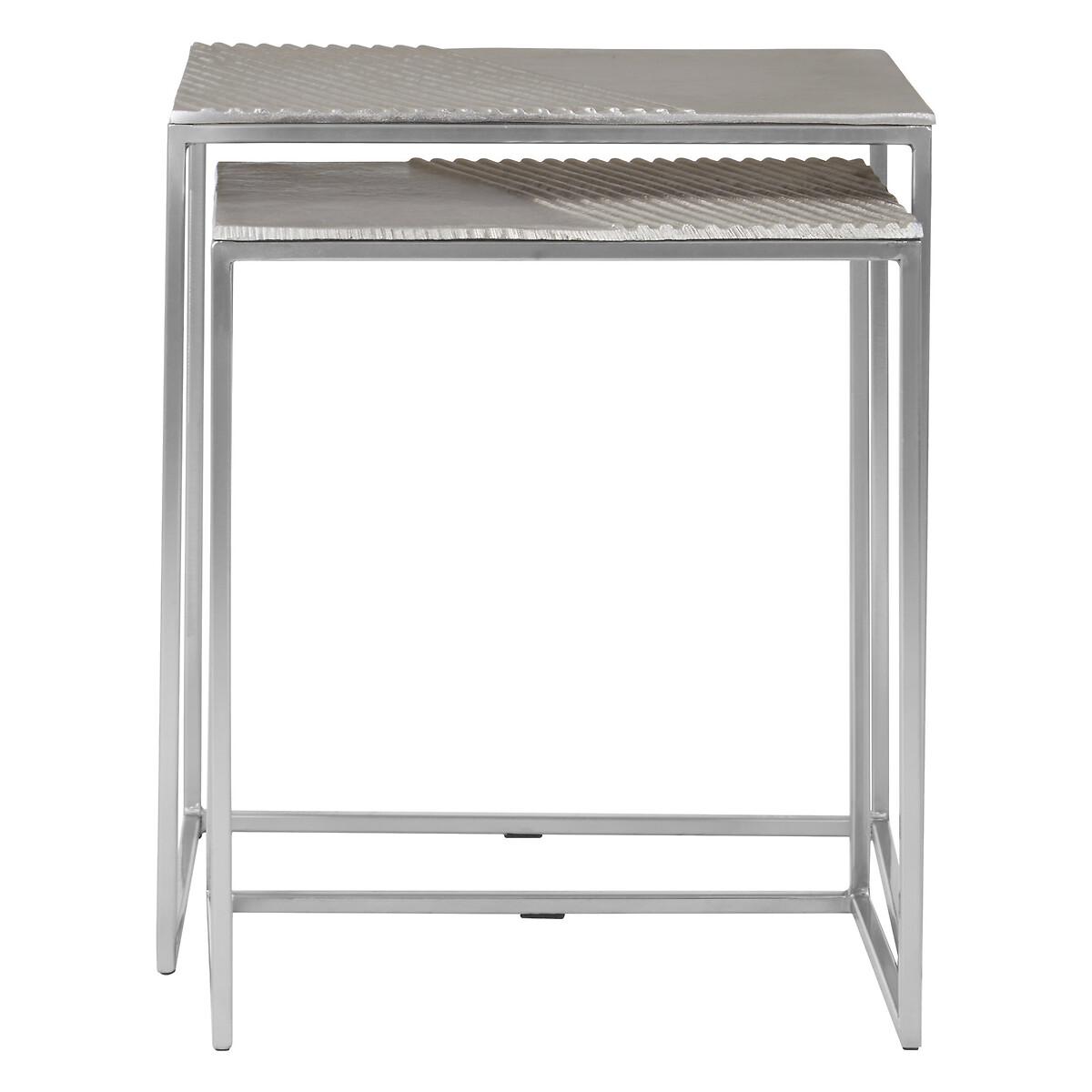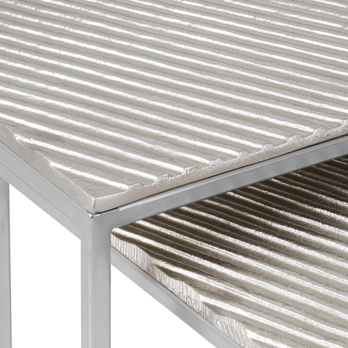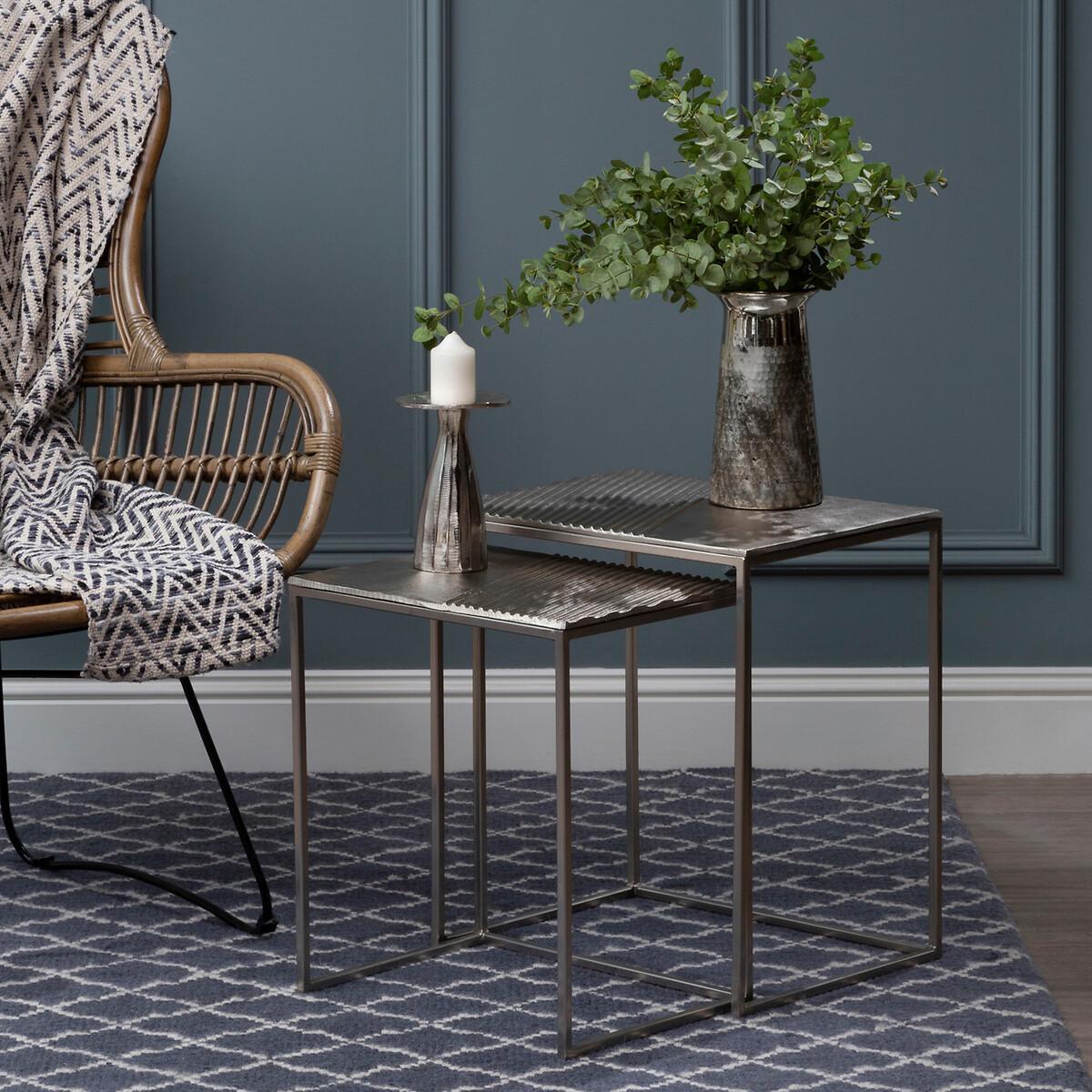 The square top of each table sports a combination of textured finishes, with diagonal grooved lines contrasted against a smoother section. Crafted from iron, they boast a nickel coating for a sleek and reflective finish. The smaller one nests under the larger, making them ideal for small spaces. Product details Fully assembled Care instructions Wipe clean with a soft cloth. Do not use abrasive cleaners. Product Composition - Metal. Product Dimensions - 51 cm x46 cm x36 cm , Weight - 5.5 kg. Package Dimensions - 51 cm x 39 cm x 37 cm, Weight 9 kg. This product will be dispatched by one of our trusted suppliers. You’ll be contacted by their selected courier about your delivery. PREMI01