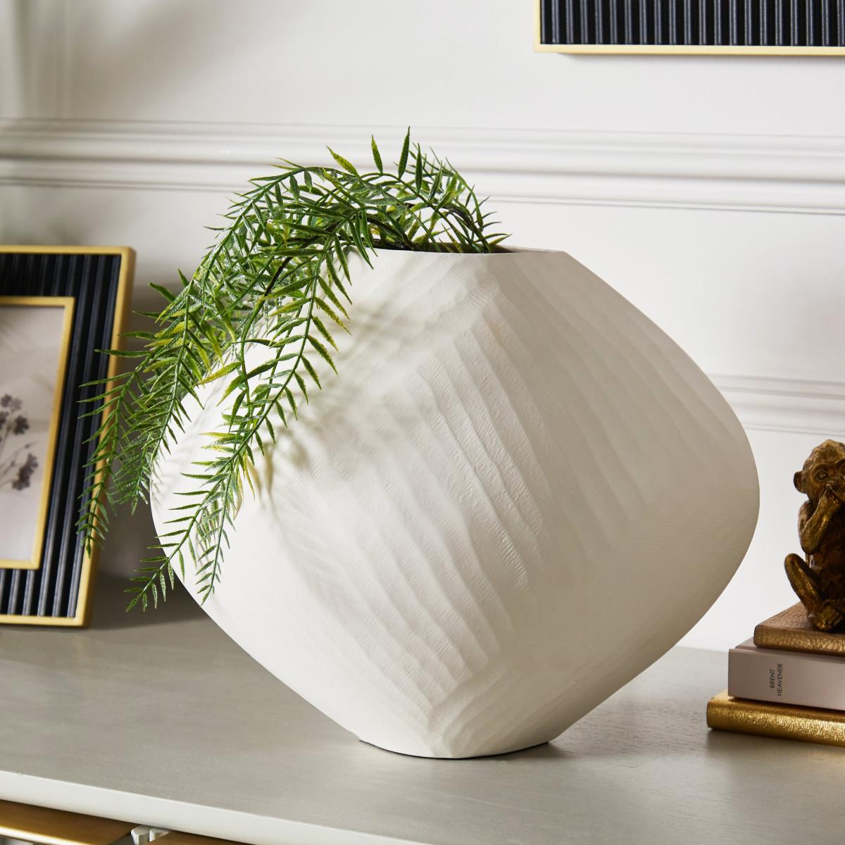 I love this vase because its textured metal finish adds a subtle yet modern touch to a range of interiors. It's particularly effective in minimalist or contemporary spaces, where its clean silhouette can stand out, or in neutral settings, where it brings a bit of visual interest. For styling, I recommend filling it with fresh or dried botanicals to play up the texture, or leaving it empty for a sculptural statement piece. Its versatile white colour makes it easy to incorporate into most colour schemes, from monochrome to lush, colourful schemes. It works well on console tables, sideboards, or as a centrepiece on a dining table, adding depth and sophistication without overwhelming the space.