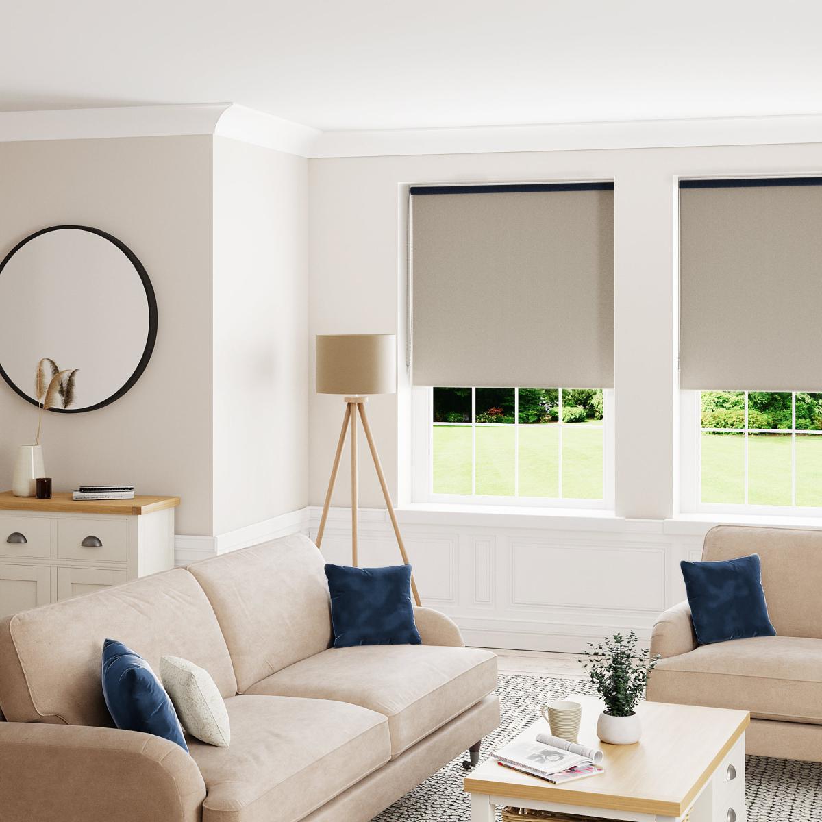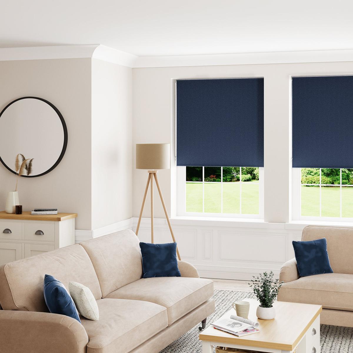 This unique blackout roller blind features a versatile, plain textured print in contrasting navy and pebble colourways on the face and reverse of the fabric. Choose and change between the two sides to suit your decor or mood, by simply rolling the fabric the other way around. The double laminate feature of this blackout roller blind provides very high levels of insulation and helps to reduce any unwanted external noise and light. The durable metal side chain adds a contemporary touch to this roller blind, which is available in a choice of sizes to fit your windows and comes with all fixtures included. Please note: The width stated is for the fabric only, please allow an extra 3. 2cm for the brackets and mechanism. Always check specific fitting instructions and check measurements for your blind once purchased before cutting to size. To see instructions, please click. Here.