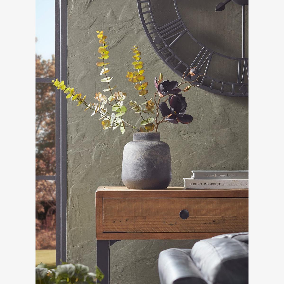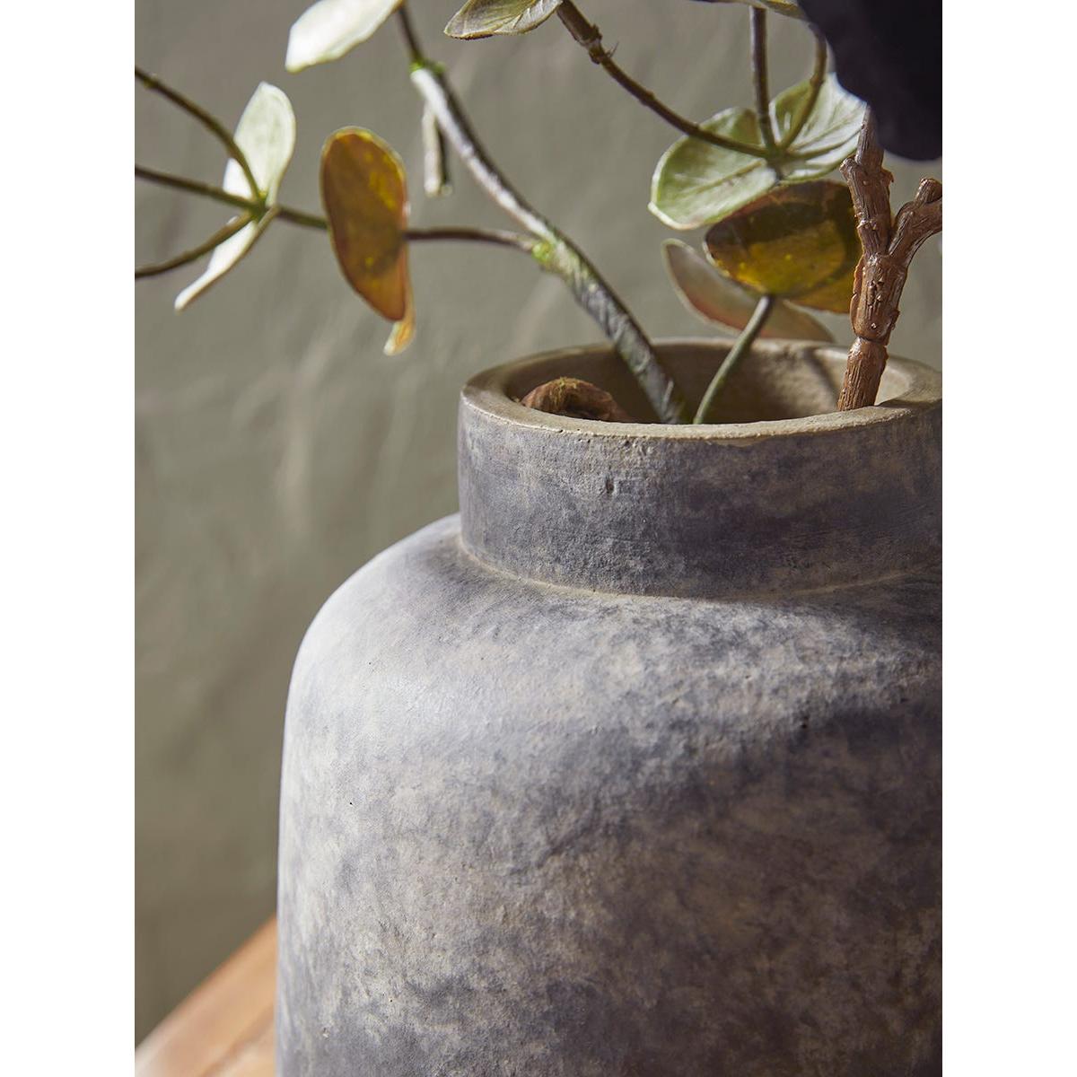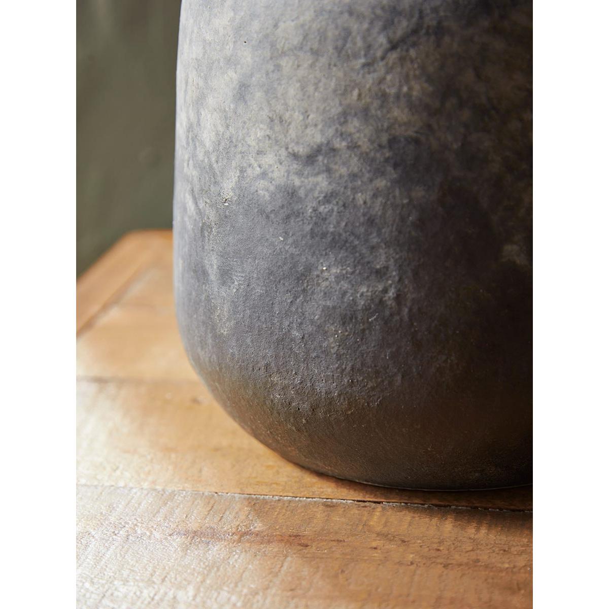 A bold vase with a strong body and rich textural finish in stoneware which looks like it has been hewn from solid rock. An engaging piece with which to accessorise an industrial scheme. Soften the lines with faux blooms or dried grasses.