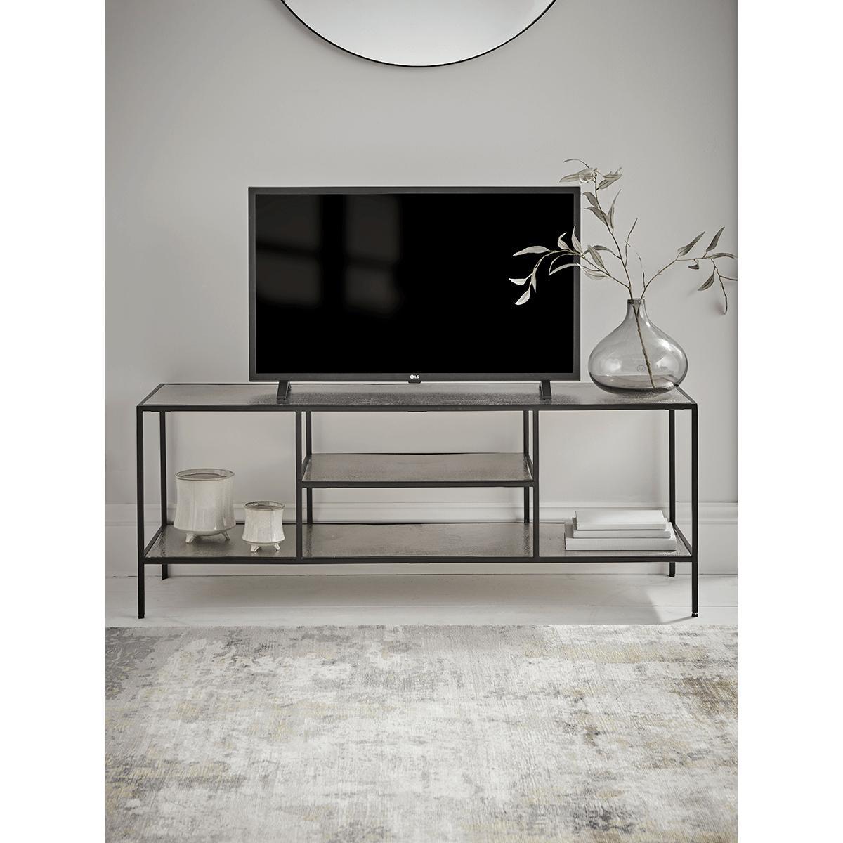I really like this metal media unit because of its sleek, modern feel and versatile burnished silver finish. It works well in contemporary and minimalist interiors, especially those with black, grey, or metallic accents. The open-frame design adds an air of lightness, making it ideal for smaller spaces or rooms aiming for an uncluttered look. When styling, consider keeping the top surface simple with a statement vase or decorative tray, and utilise the lower shelf for media accessories or books. Its understated design allows it to blend seamlessly with various interior styles, from industrial to chic, providing both practical storage and a polished aesthetic.