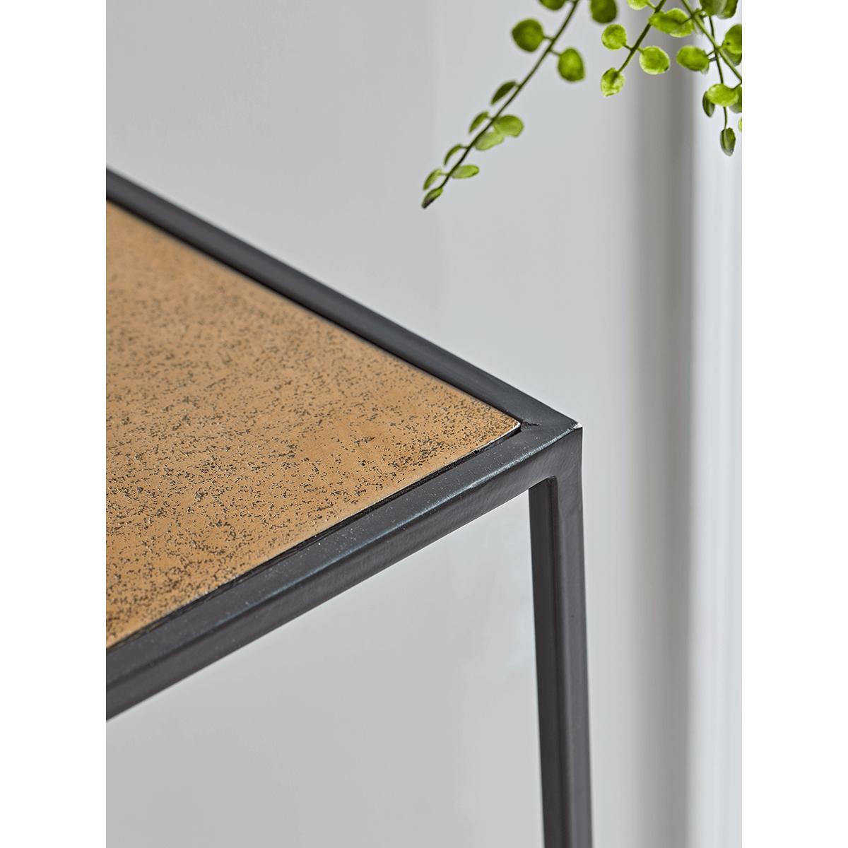 A distinctive storage console, of industrial tone, one that stands out by design with a slender metal stepped framework accented with gold. A real highlight in the home, a statement piece to set the mood of any room.