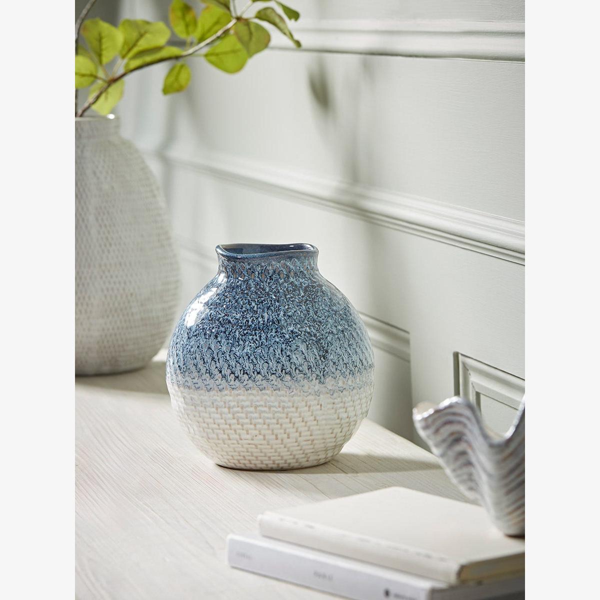 Crafted from stoneware in a simple sphere shape, this vase has organic scultptural lines, creating a uniqueness to it. With its two toned design, the cream base gently blends up into the blue, creating a pattern that is different at each angle you look at it from, enhacing the organic nature to the vase and bringing a sense of calm to your home.
