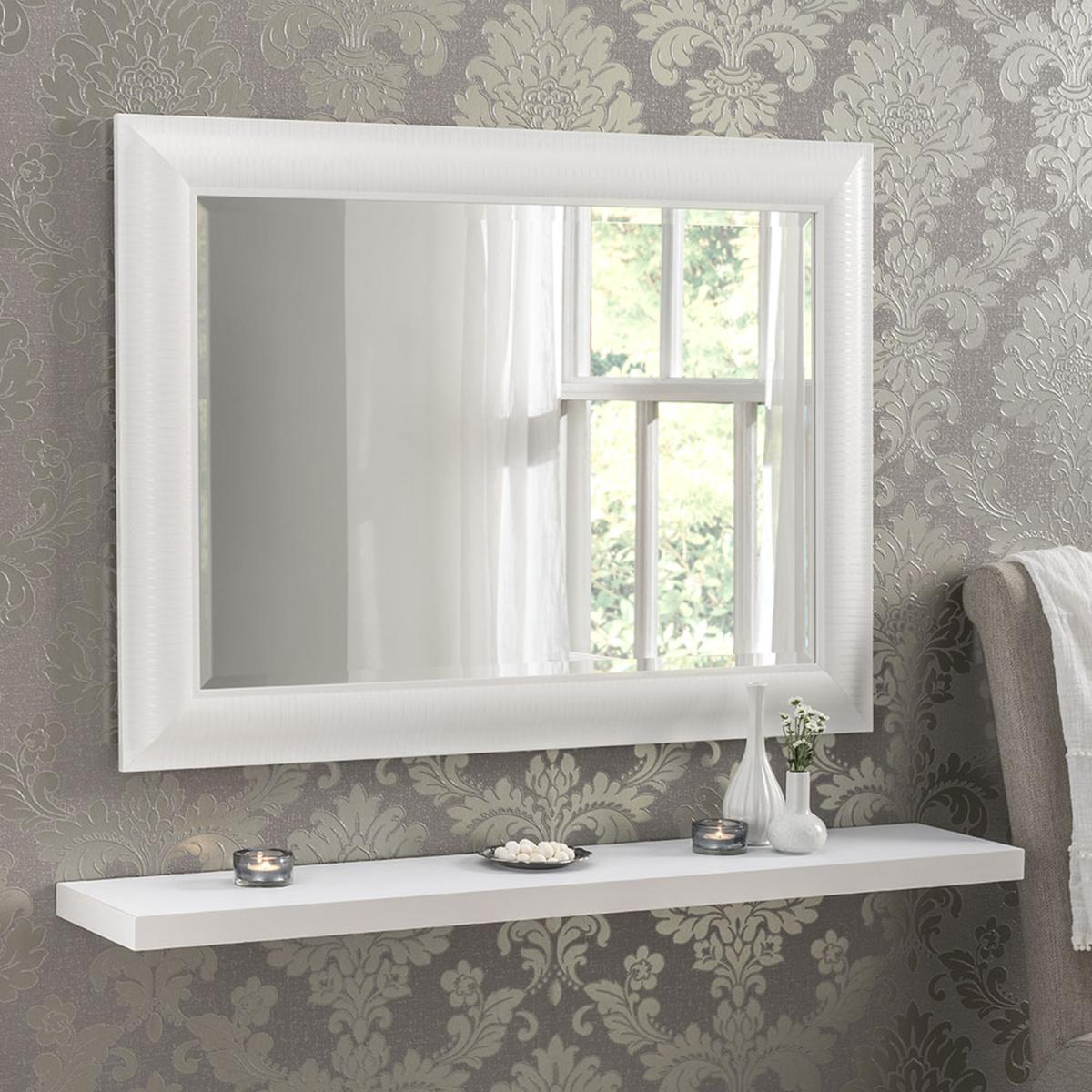 White two-tonal framed wall mirror with a scooped profiled frame. Combination of matt and gloss white textured frame. The mirror glass has a really clear reflection with bevelled edges to enhance the look and feel. Can be wall-hung vertically as well as horizontally. Handmade in the UK by skilled artisans.